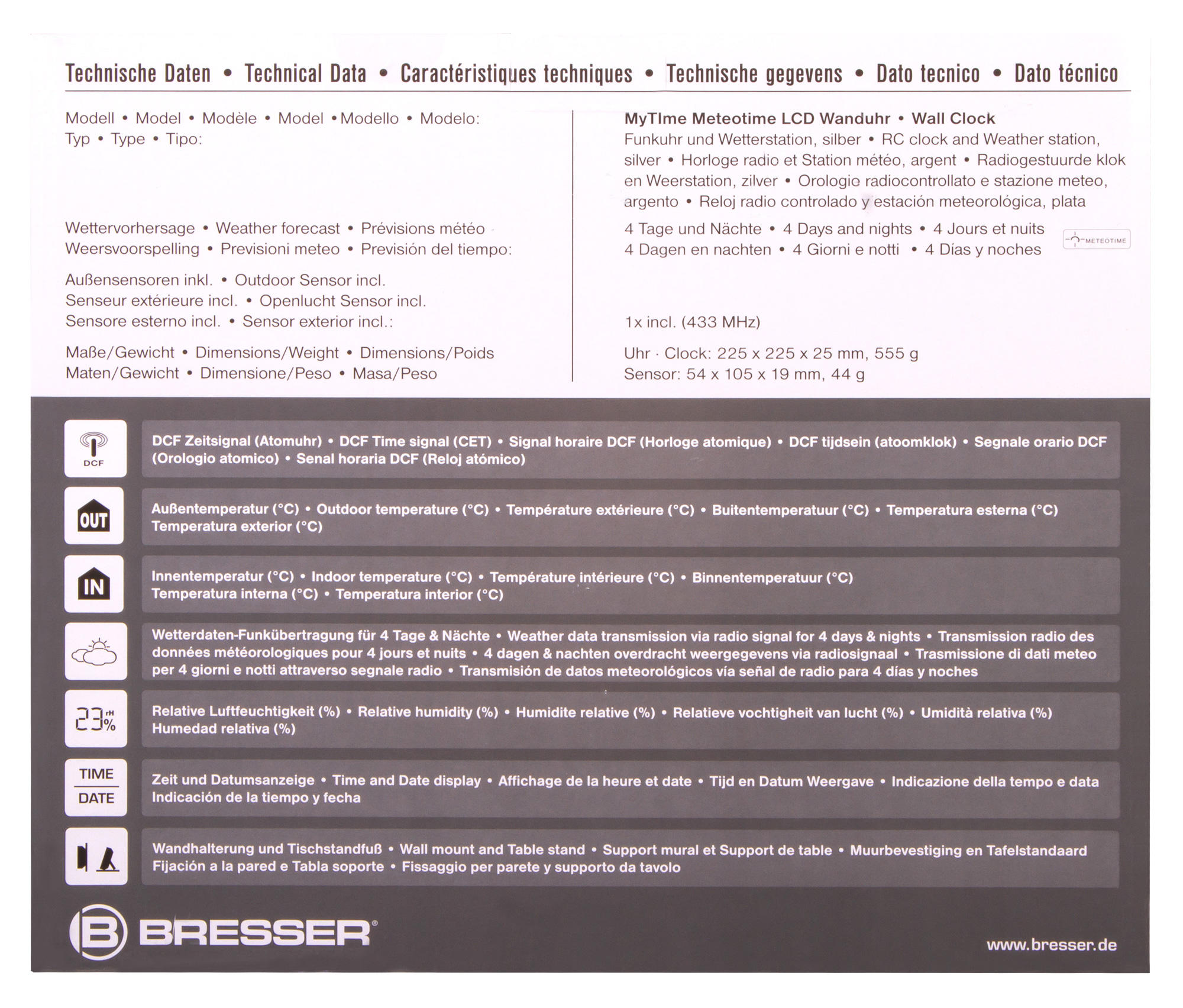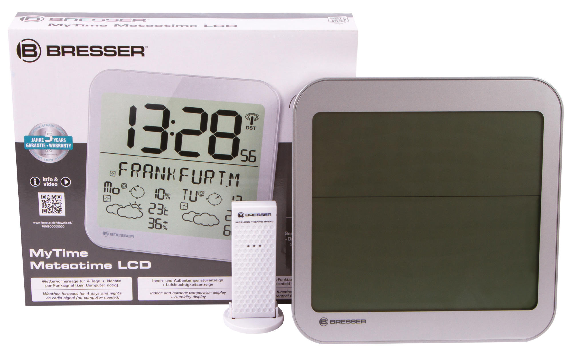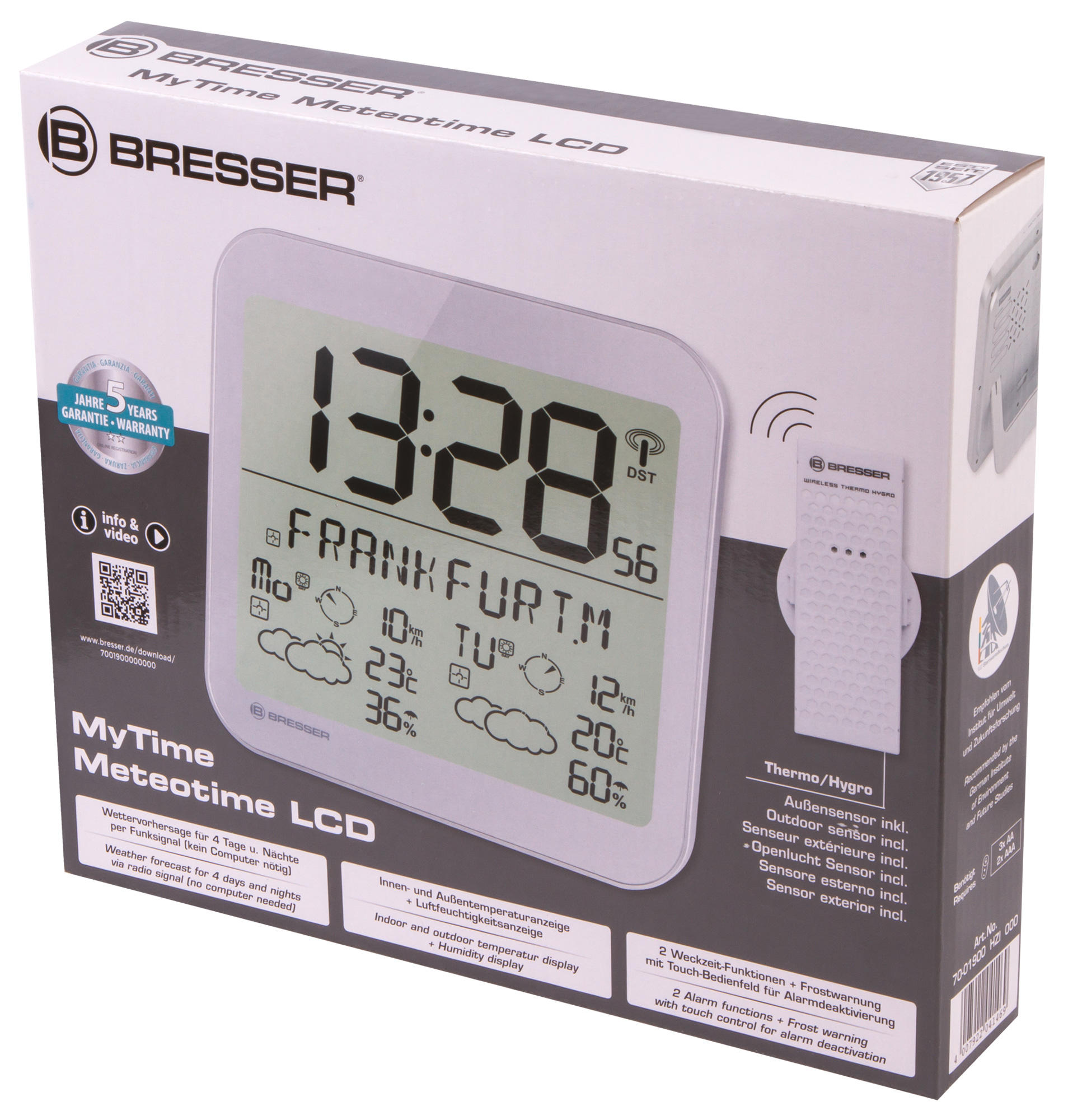 Bresser MyTime Meteotime LCD – часы в современном дизайне, которые умеют не только показывать время. Также они измеряют температуру в доме и на улице, определяют уровень влажности, загружают из интернета прогноз погоды на несколько ближайших дней. Прогноз доступен для сотен регионов. Отличительная особенность этой модели часов – крупная индикация, хорошо различимая с большого расстояния.