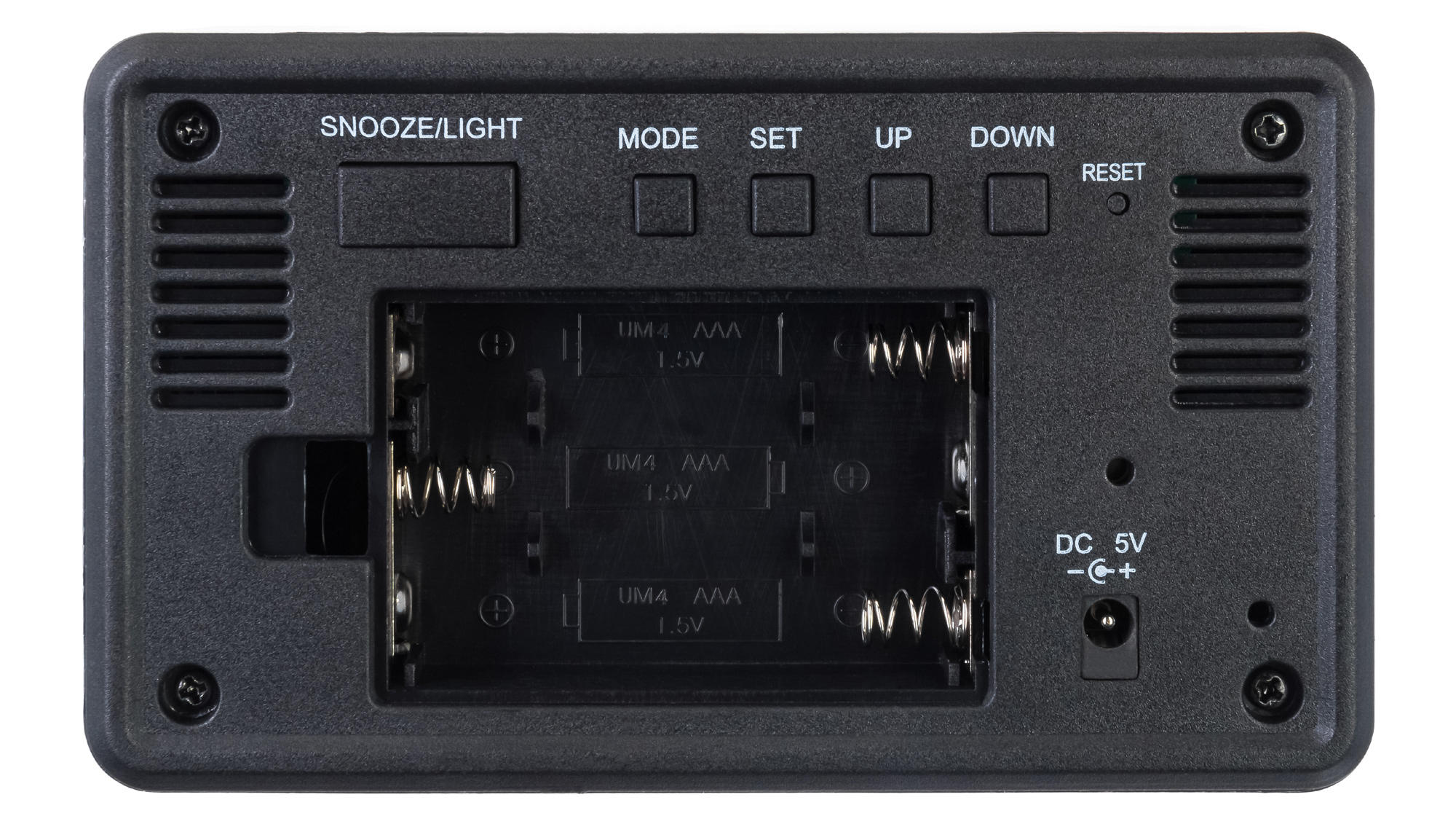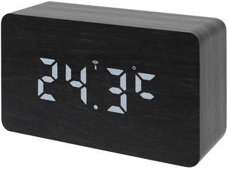 Интересно реализован экран: индикация как будто проступает сквозь переднюю панель корпуса. Цифры крупные, хорошо читаются даже с большого расстояния. Есть белая светодиодная подсветка с тремя уровнями яркости. Также можно выбрать режим отображения показаний: только одно (время, дата или температура) или попеременное отображение всех трех в автоматическом режиме.