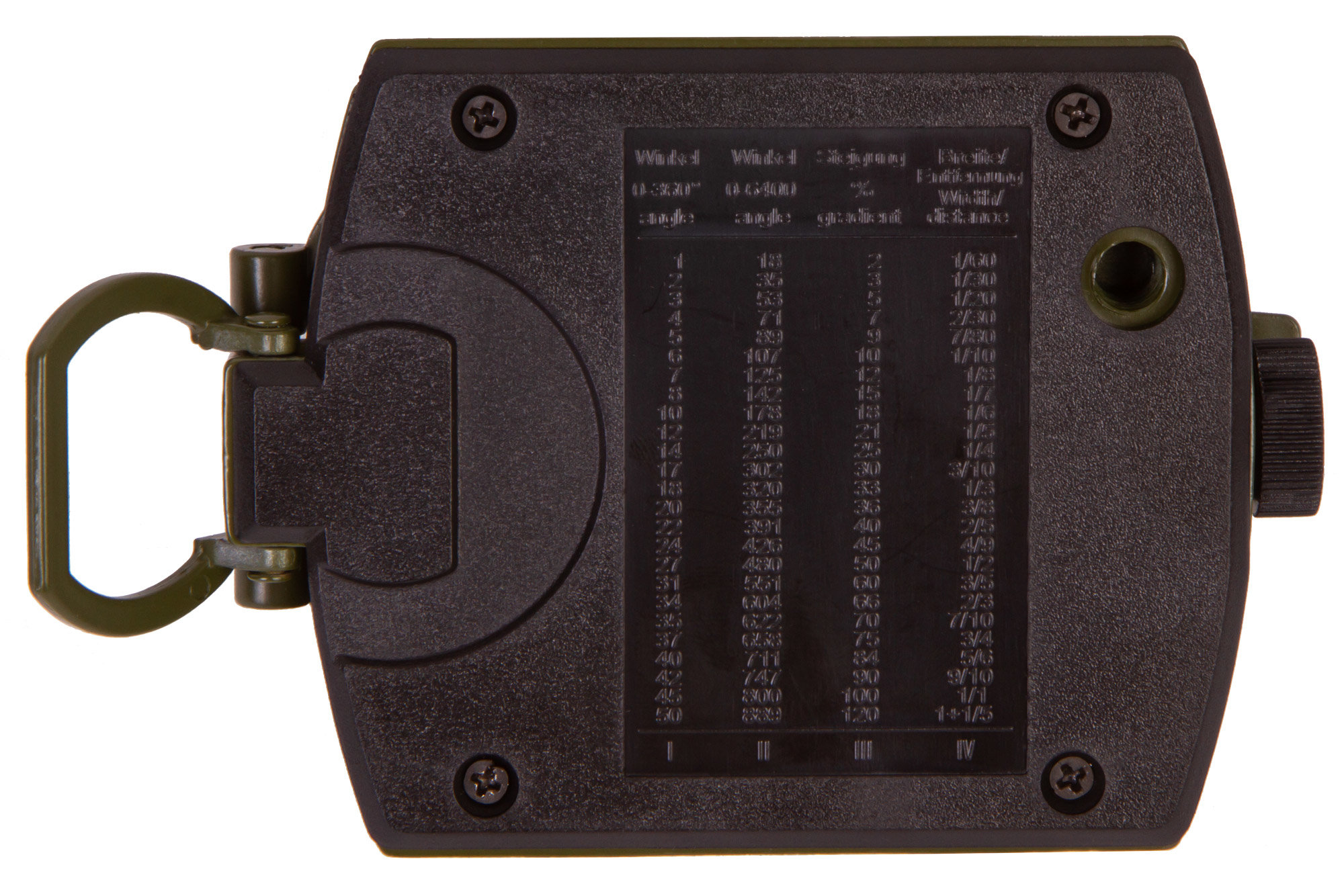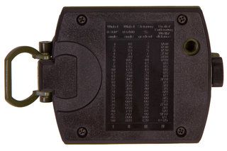 В компасе присутствует визир с прицельной меткой и угломерной шкалой, который применяется для ориентирования на местности по удаленным объектам. Для работы с картами можно использовать линейки на корпусе. Кроме того, на задней крышке есть таблица с формулами.