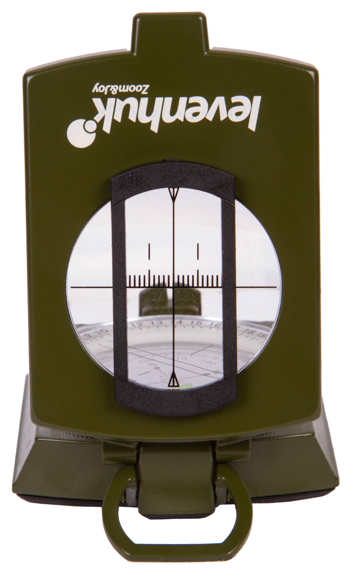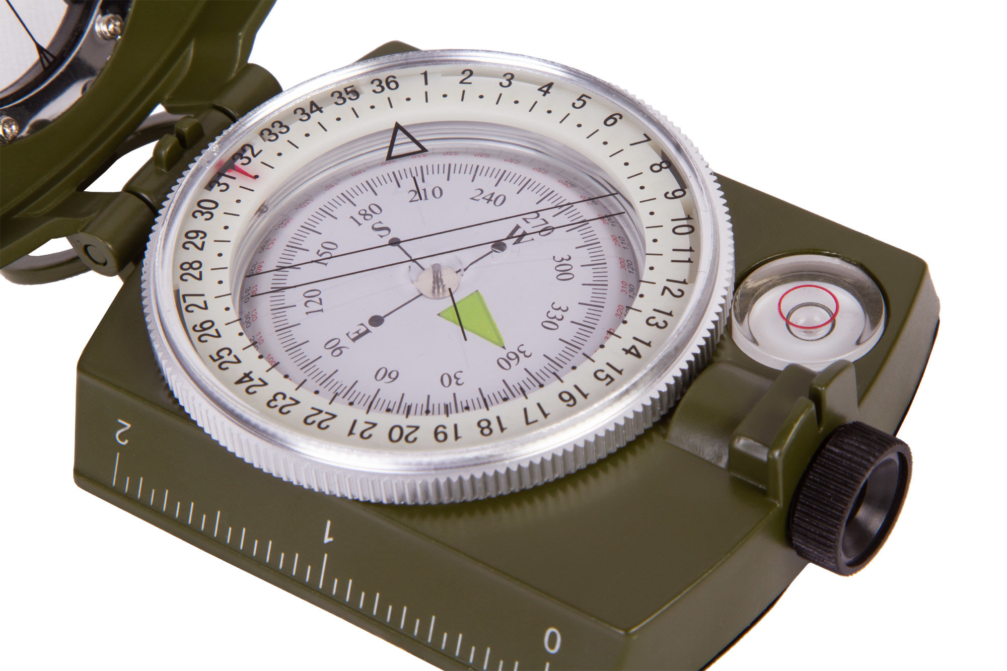 У компаса складная конструкция, в верхней крышке имеется большое окно. Через него видно циферблат, поэтому использовать компас можно не только в открытом, но и в закрытом состоянии. Сам циферблат находится в демпфирующей жидкости, которая ускоряет стабилизацию магнитной стрелки. На лимбе присутствует сразу несколько градусных шкал. Стрелка свободно движется при любом наклоне компаса, но для идеальной работы рекомендуется выравнивать его по горизонтали при помощи встроенного пузырькового уровня.