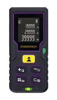 Данные измерений и расчетов выводятся на ЖК-экран с тремя строками, в памяти устройства одновременно хранится до 20 групп данных. Максимальное расстояние, доступное для измерения рулеткой Ermenrich Reel PLUS GD40, составляет 40 метров. Прибор легко удерживается одной рукой, эргономично расположенные кнопки облегчают управление. Питание устройства осуществляется от 2 батареек ААА, один комплект обеспечивает более 5000 измерений. Предусмотрены беззвучный режим работы и функция автоотключения.