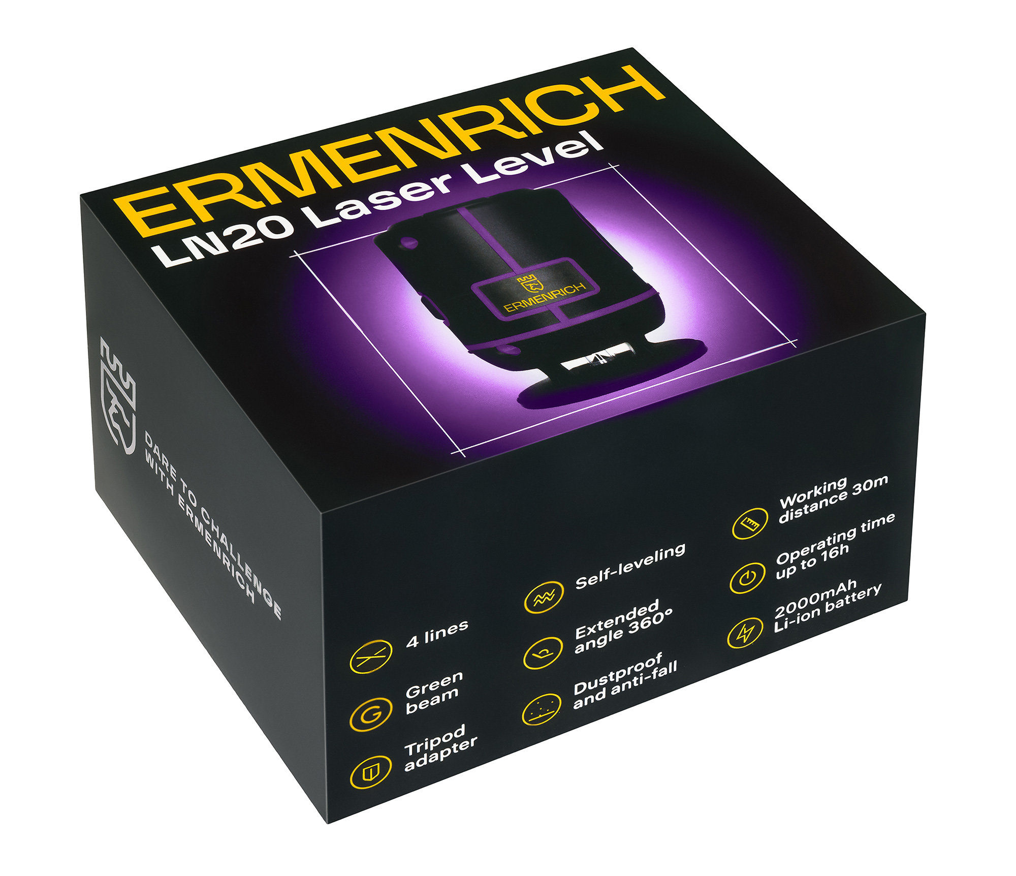 Надежным помощником для строителя и мастера отделочных работ станет Ermenrich PLUS LN20 – портативный самовыравнивающийся уровень с лазером зеленого цвета. Он формирует четыре линии в горизонтальной плоскости, угол развертки составляет 360 градусов, а дальность работы – 30 метров. Это позволяет охватить большую площадь и избежать ненужных перемещений уровня. Кроме того, прибор поддерживает установку на штатив со стандартным креплением 1/4".