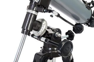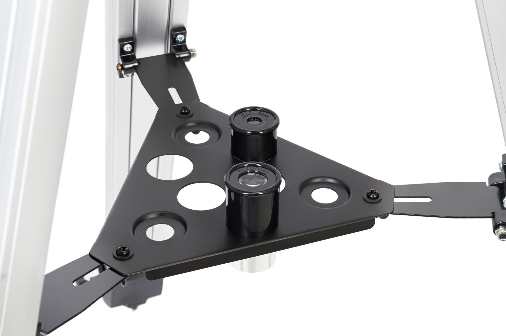 Экваториальная монтировка управляется вручную при помощи ручек тонких движений. Она позволяет точно и плавно вести объекты по небосклону при минимуме затрачиваемых усилий. Тренога сделана из алюминия и дополнена полочкой для аксессуаров. Высоту ножек треноги можно регулировать.