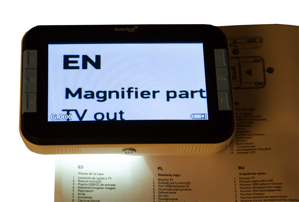 Лупа имеет богатый функционал. Ее можно использовать без подключения к сети – от аккумулятора лупа работает до 120 минут. При помощи комплектных кабелей лупу легко подсоединить к телевизору или ноутбуку. Вы сможете делать снимки экрана и сохранять их на карту памяти или жесткий диск компьютера. Для использования лупы при плохом освещении есть встроенная светодиодная подсветка.