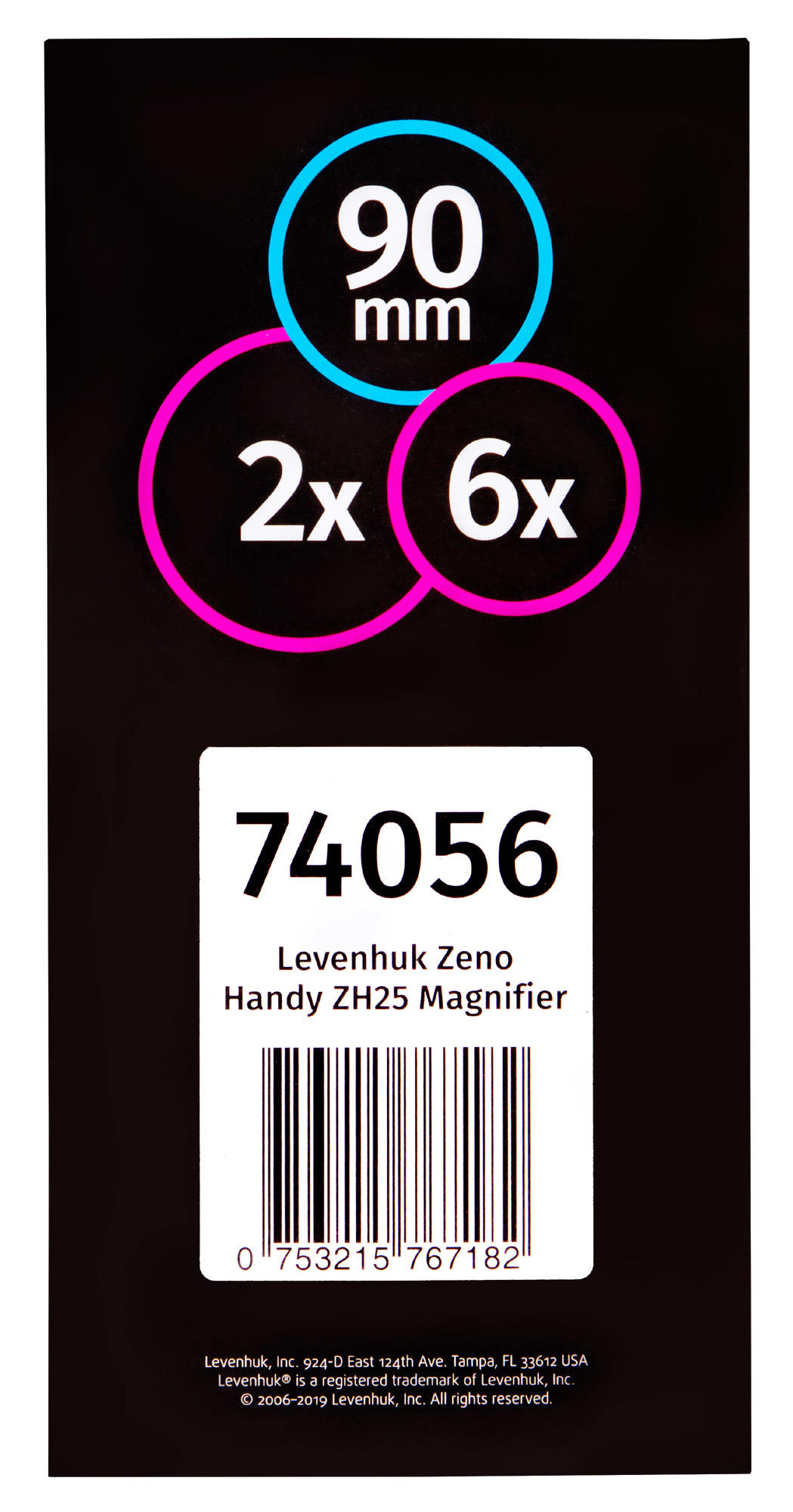Levenhuk Zeno Handy ZH25 – просмотровая лупа с бифокальной линзой, которая дает увеличение в 2 и 6 крат. На малой кратности удобно работать с протяженной областью (до 90 мм), на большой – изучать миниатюрные детали объектов. Лупа прекрасно подходит для разбора мелкого текста, чтения чертежей и географических карт, рассматривания поверхностных дефектов на разных предметах.