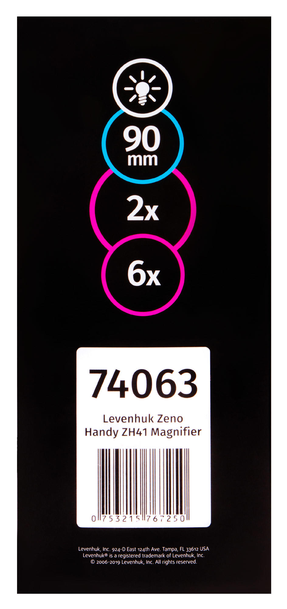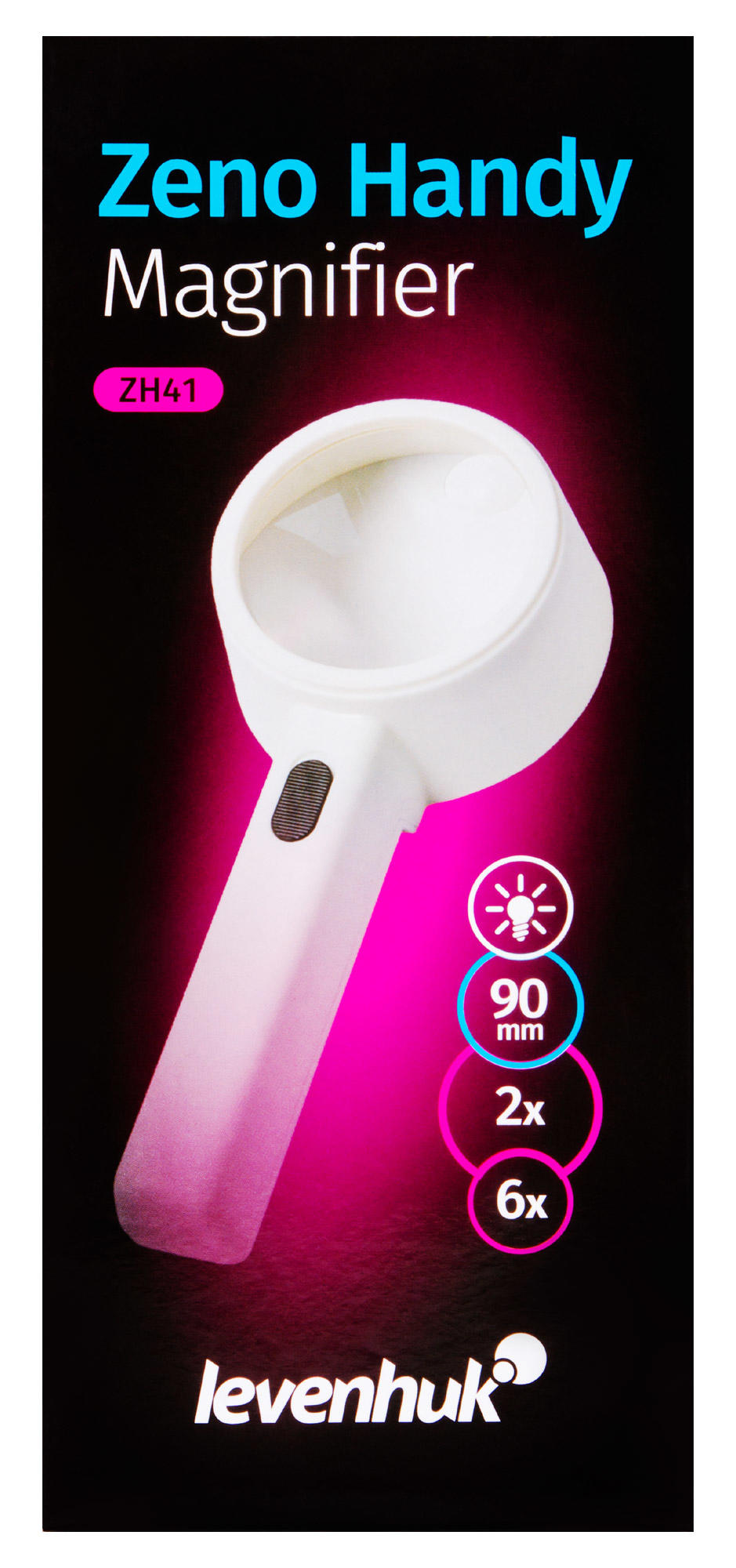 Levenhuk Zeno Handy ZH41 – ручная лупа с подсветкой, которая пригодится в работе с мелкими объектами. С ее помощью можно прочитать текст, набранный небольшим шрифтом, или рассмотреть крохотный дефект на одежде или мебели. Лупа дает два увеличения – 2 и 6 крат. Работать можно или с большой (90 мм), или с маленькой (21 мм) областью.