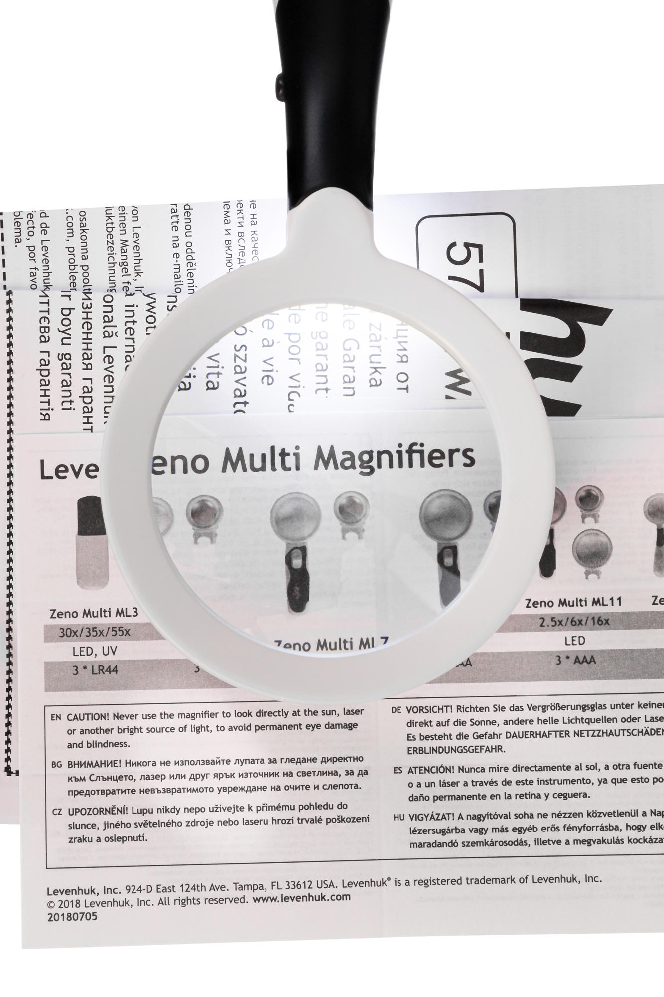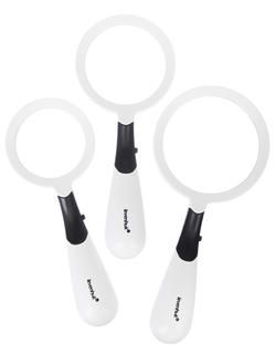 Levenhuk Zeno Multi ML13 – это набор из трех просмотровых луп разного диаметра. Лупы дают увеличение в 2, 3 и 4 крат. Все элементы конструкции сделаны из пластика: ручка, оправа и линза. Каждая лупа снабжена светодиодной подсветкой, яркость которой можно регулировать. Подсветка состоит из двух независимых светодиодов – можно включать только один или два одновременно.