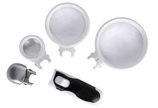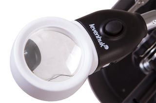 Система освещения состоит из шести светодиодов на штативе (угол их наклона регулируется) и двух светодиодов в ручке. Если на штатив вместо линзы установить плафон, получится удобная настольная лампа. Обе подсветки работают от батареек или от сетевого адаптера (последний совместим только с подсветкой на штативе).