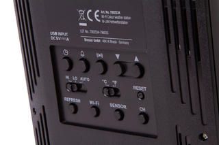 Метеостанция управляется при помощи кнопок на корпусе: частично они вынесены на переднюю панель, частично расположены на задней крышке. Датчик и основной модуль не нужно связывать проводами, так как данные передаются по радиоканалу. Метеостанция работает от сети переменного тока, датчик – от батареек.
