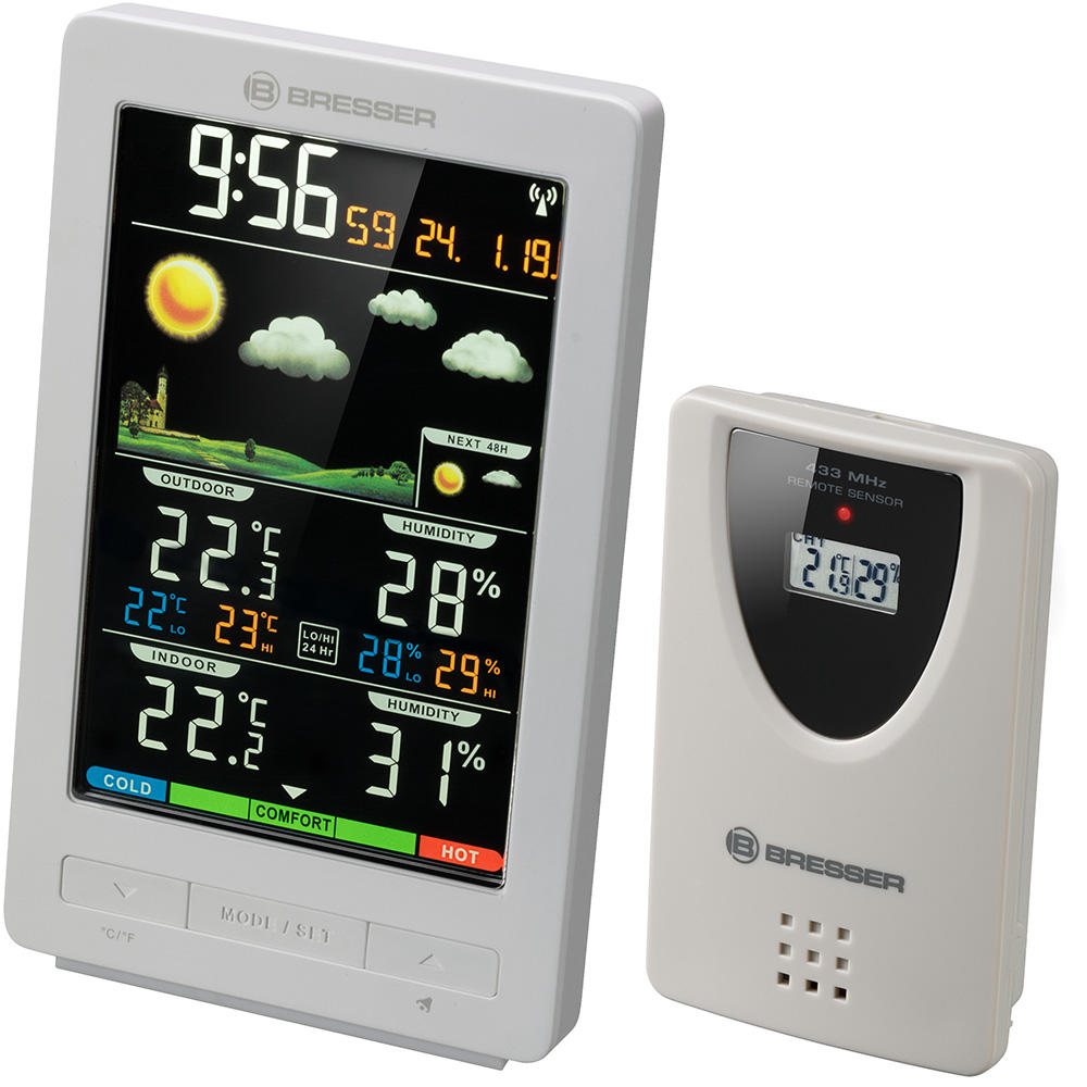 Bresser ClimaTemp WS – это домашняя метеостанция, измеряющая температуру и влажность воздуха, составляющая прогноз погоды на период до двух суток, а также показывающая время и дату. Кроме того, прибор определяет минимумы и максимумы показаний за прошедшие 24 часа и уровень общего комфорта. В комплектацию включен беспроводной датчик, который можно установить на расстоянии до 70 метров от основного модуля.