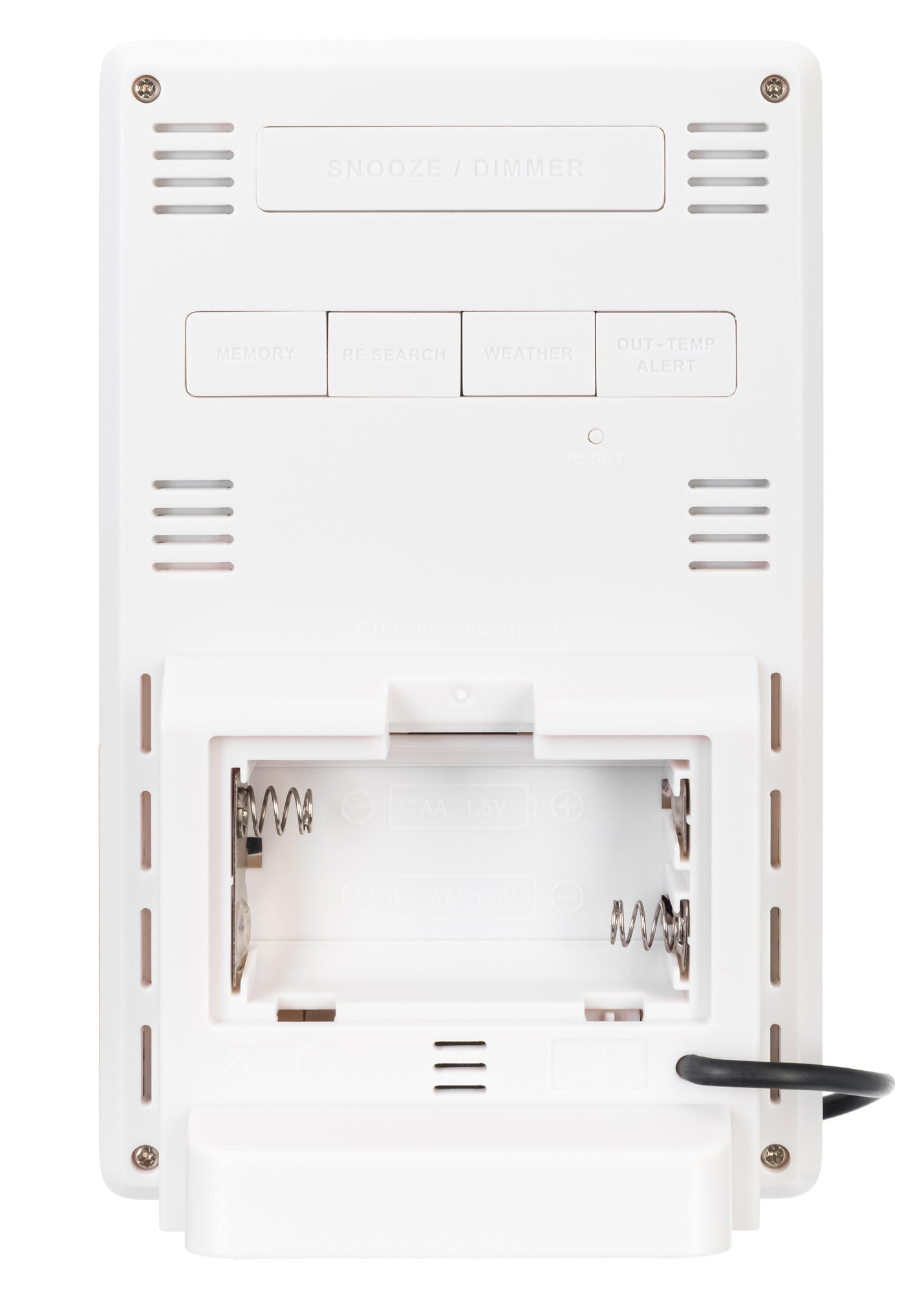 Датчик передает сведения по радиоканалу, поэтому прокладывать провода от него до метеостанции не нужно. Питание основного модуля осуществляется от сети переменного тока, но при необходимости можно установить резервные батарейки. Кнопки управления расположены на передней панели и задней крышке метеостанции, возможно настенное и настольное размещение прибора.