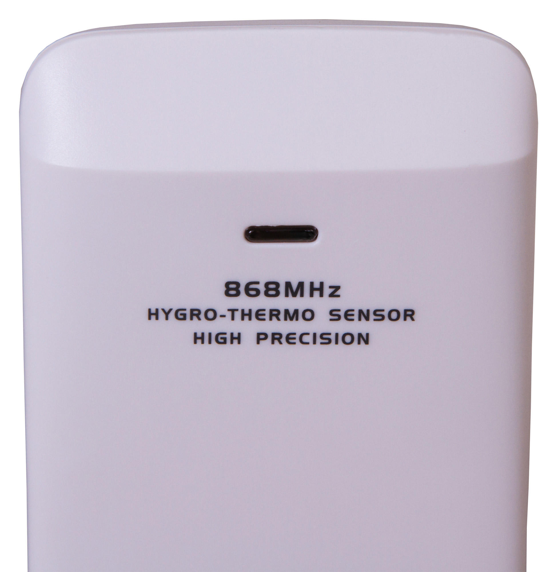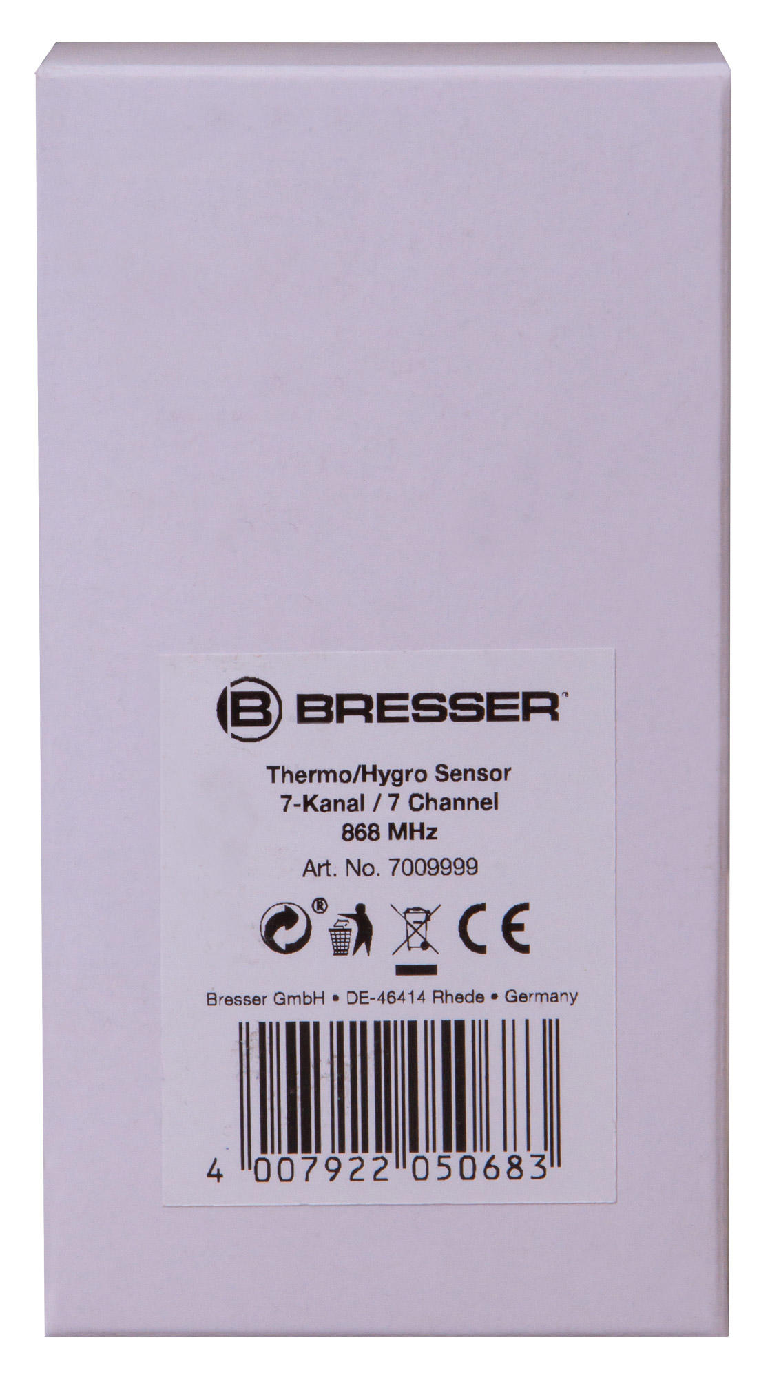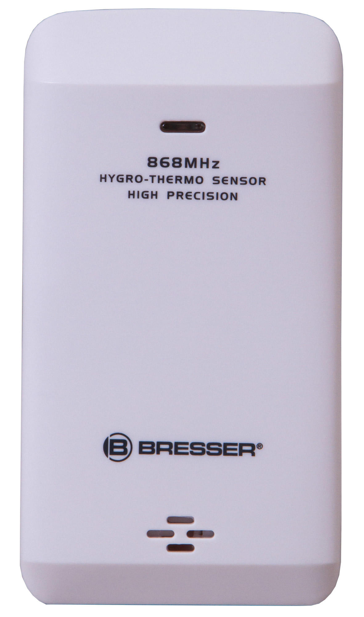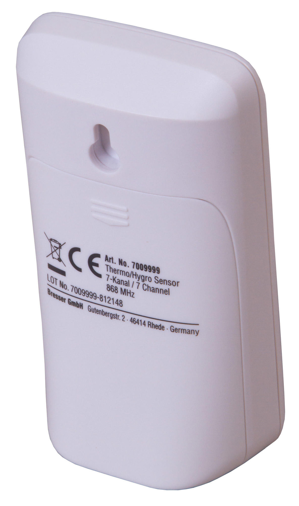 Этот датчик Bresser работает на частоте 868 МГц, поэтому подходит для работы со многими профессиональными метеостанциями. Он измеряет влажность воздуха и температуру и передает данные на основной модуль, собственного экрана у датчика нет. Дальность передачи составляет до 100 метров в прямой видимости. Переключатель радиоканалов расположен под крышкой батарейного отсека.