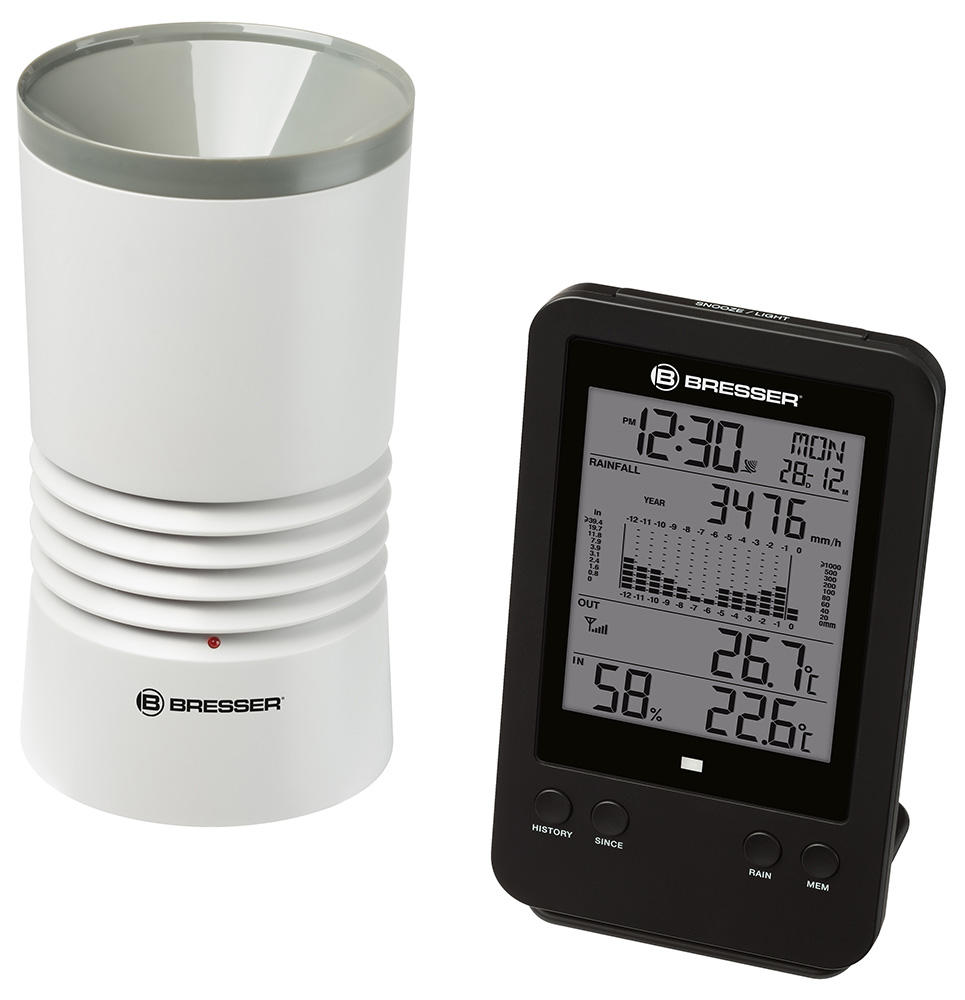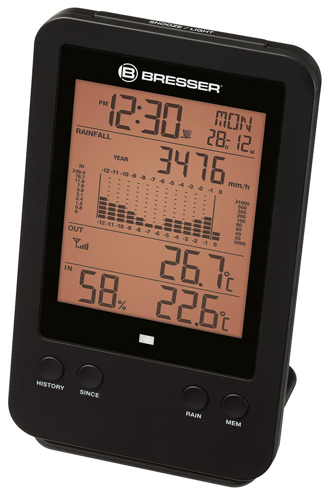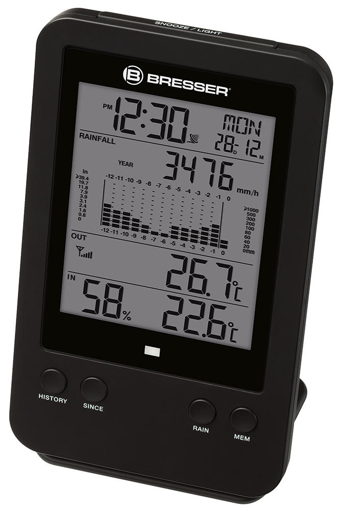 Метеостанция Bresser с профессиональным дождемером – это возможность следить за погодой за окном и, в частности, за уровнем осадков. Внешний датчик не только определяет количество выпавших осадков, но и сохраняет его в памяти. На экран метеостанции выводится гистограмма за час, день, неделю, месяц или год. Кроме того, метеостанция измеряет влажность воздуха, температуру внутри и снаружи помещения, а также показывает время, дату и день недели. Есть встроенная функция будильника.