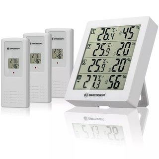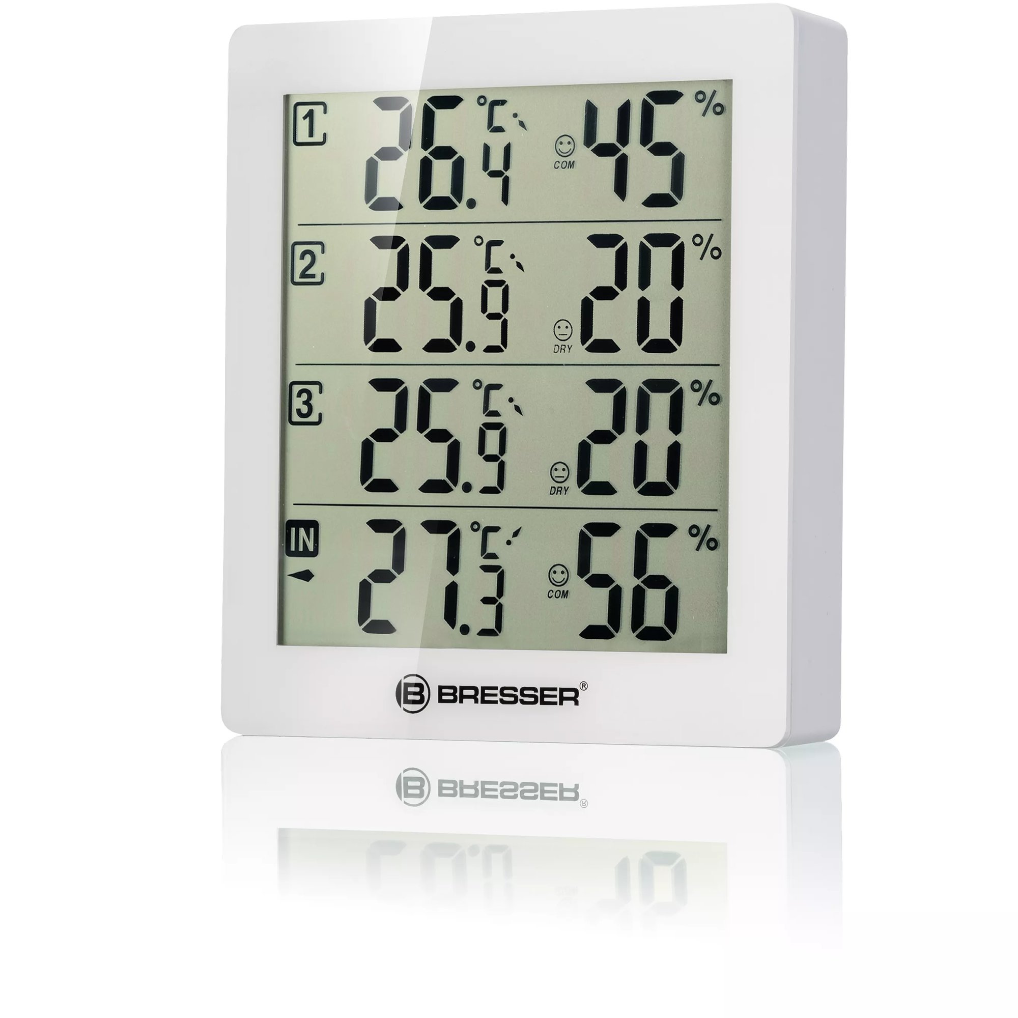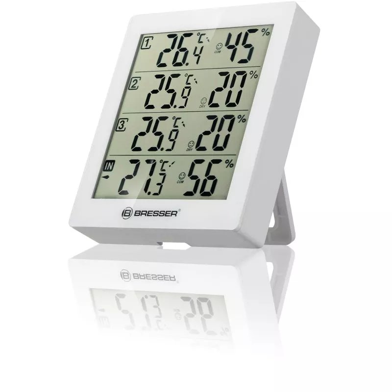 Bresser Temeo Hygro Quadro – метеостанция, которая позволяет проводить измерения сразу в четырех местах. В комплекте с ней идут три наружных датчика, которые можно разместить в любом месте квартиры или даже на улице, но расстояние до основного модуля не должно превышать 30 метров. Каждый датчик и основной модуль умеют измерять температуру и влажность воздуха, а также высчитывать уровень общего комфорта микроклимата.