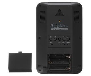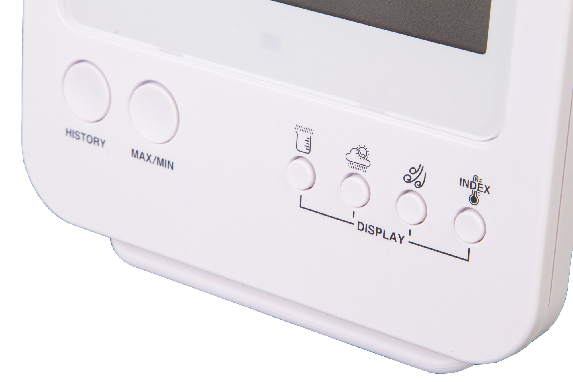 Вся информация выводится на встроенный монохромный экран. Данные легко читаются даже с большого расстояния, так как индикация четкая и контрастная. Под экраном находятся основные кнопки управления, частично кнопки вынесены и на заднюю крышку. Связь между уличным датчиком и основным модулем происходит по радиоканалу, расстояние между ними может составлять до 30 метров.