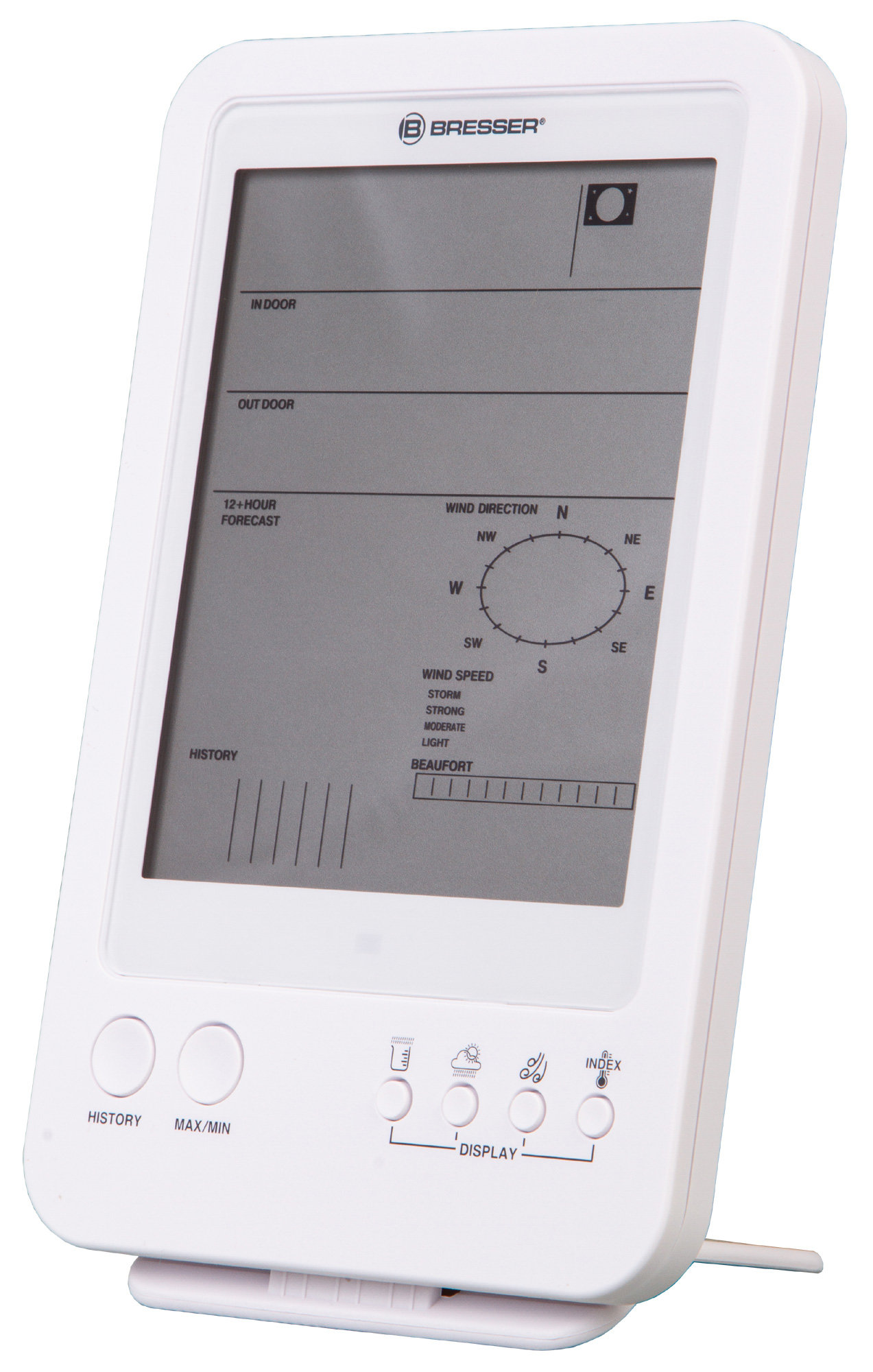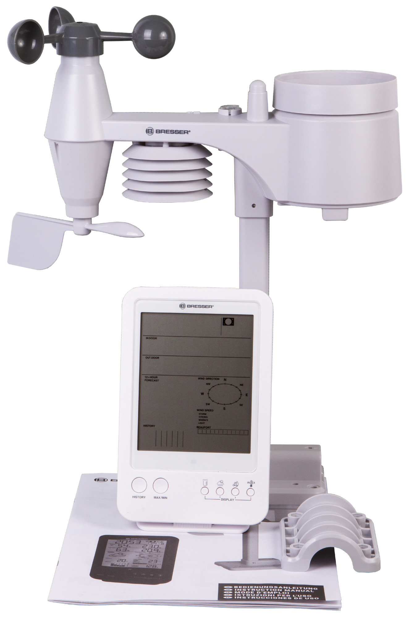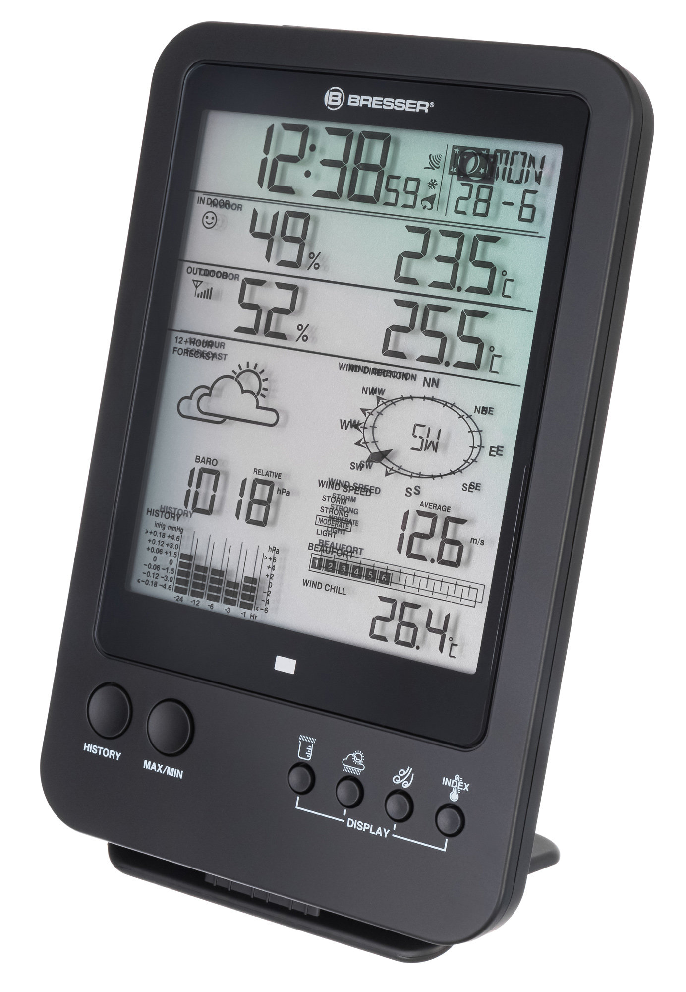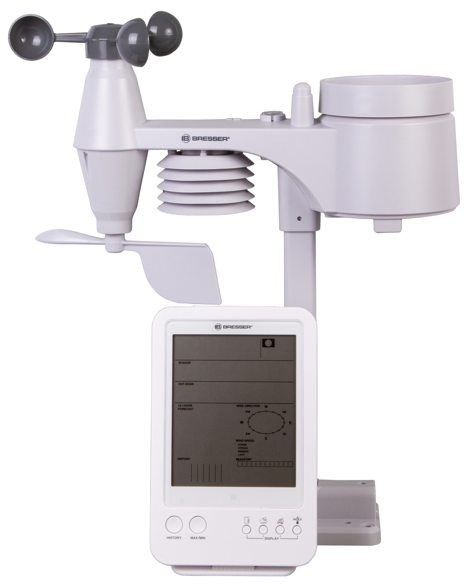Метеостанция Bresser «5 в 1» – это профессиональная метеостанция, поэтому она не только измеряет температуру, влажность воздуха и атмосферное давление, но также определяет скорость и направление ветра, уровень выпавших осадков. Кроме того, она составляет прогноз погоды, строит графики изменений метеопоказателей, отображает фазу Луны, индекс Бофорта и многое другое. Благодаря ей легко предугадывать самые невероятные капризы погоды. Также в метеостанции есть часы с будильником и календарь.