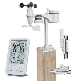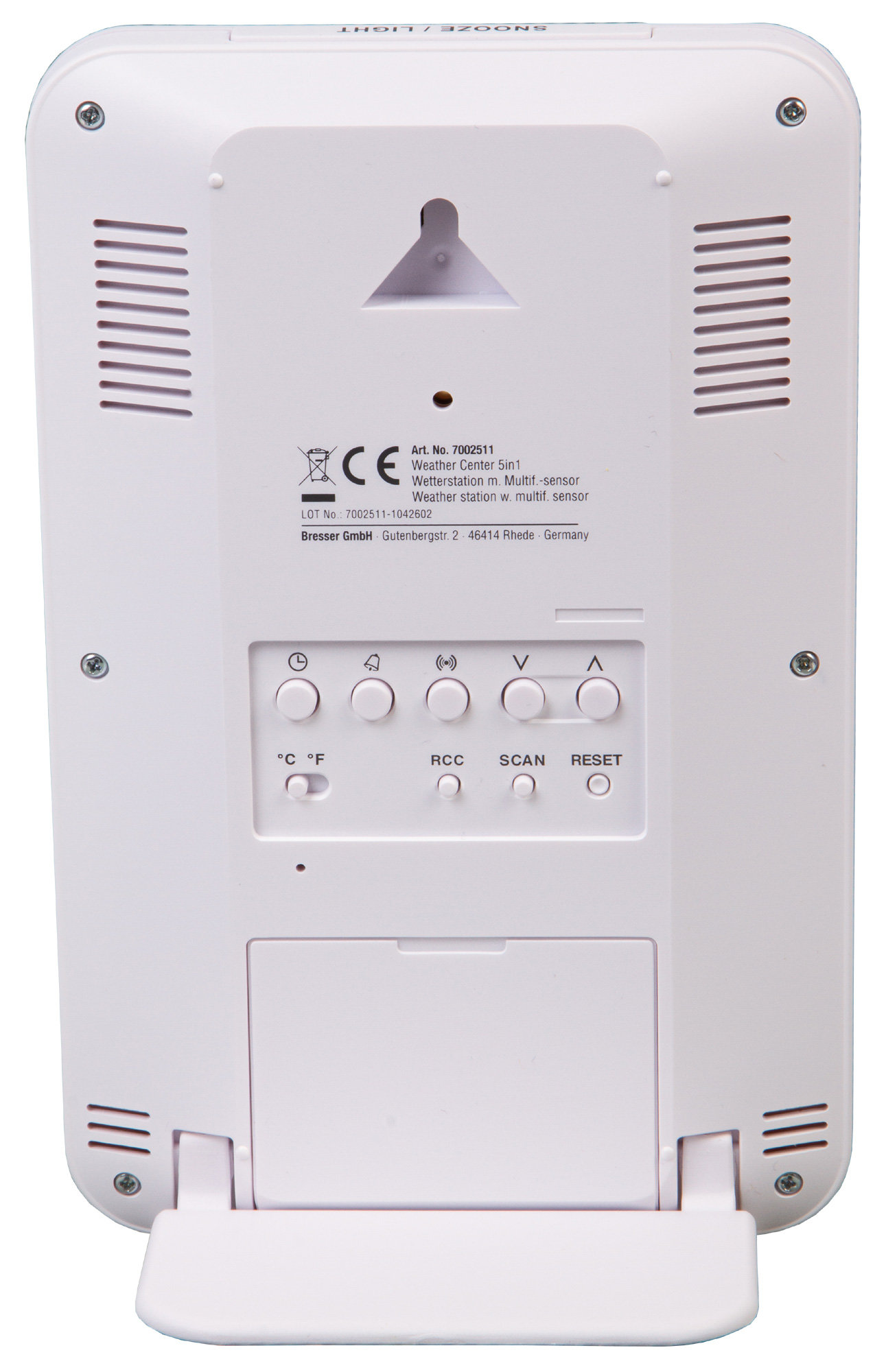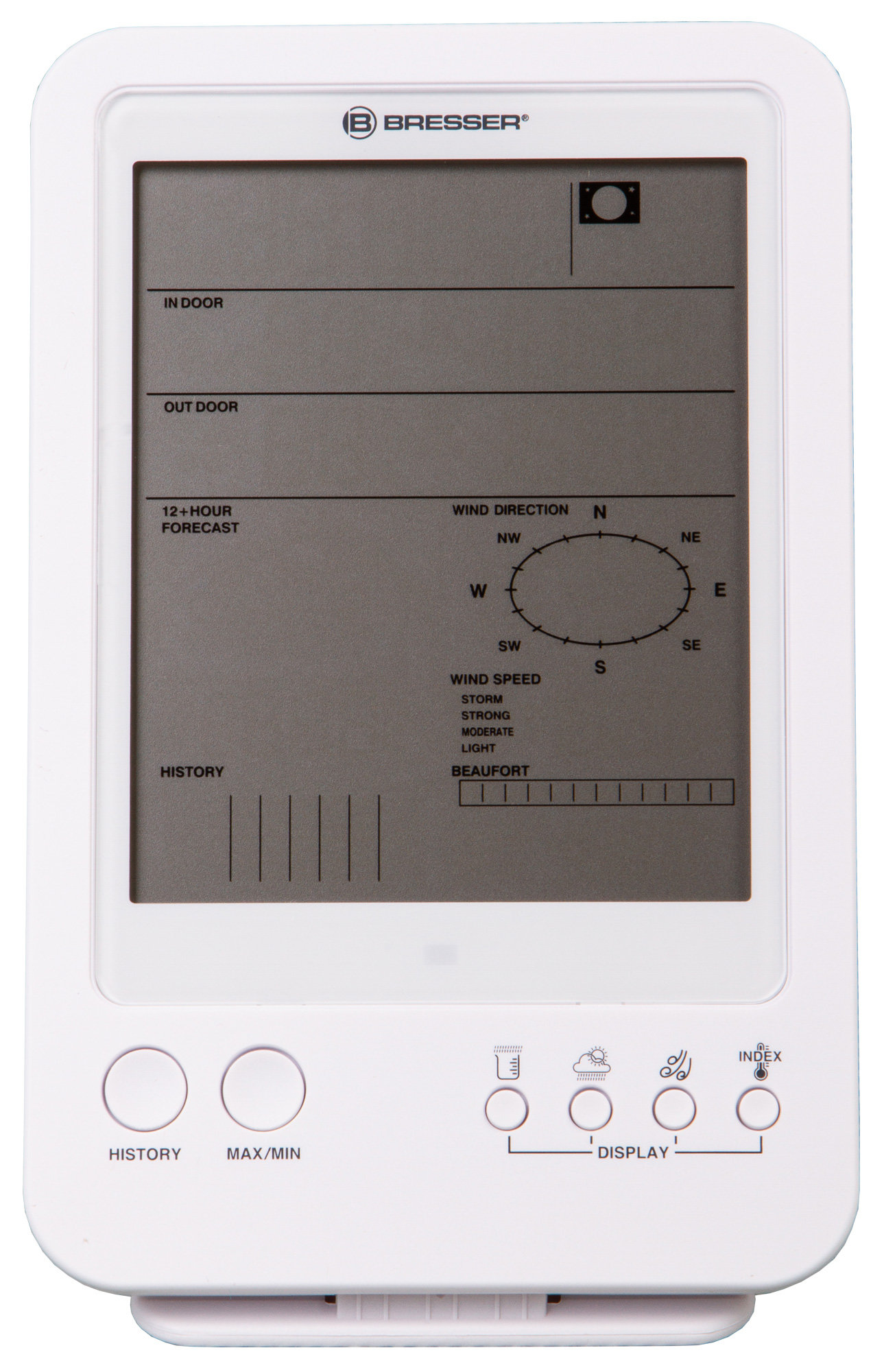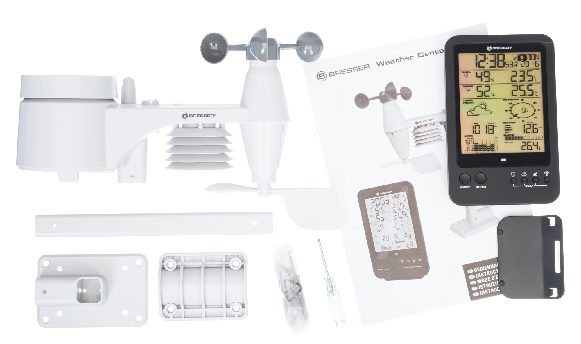 Метеостанция Bresser «5 в 1» – это профессиональная метеостанция, поэтому она не только измеряет температуру, влажность воздуха и атмосферное давление, но также определяет скорость и направление ветра, уровень выпавших осадков. Кроме того, она составляет прогноз погоды, строит графики изменений метеопоказателей, отображает фазу Луны, индекс Бофорта и многое другое. Благодаря ей легко предугадывать самые невероятные капризы погоды. Также в метеостанции есть часы с будильником и календарь.