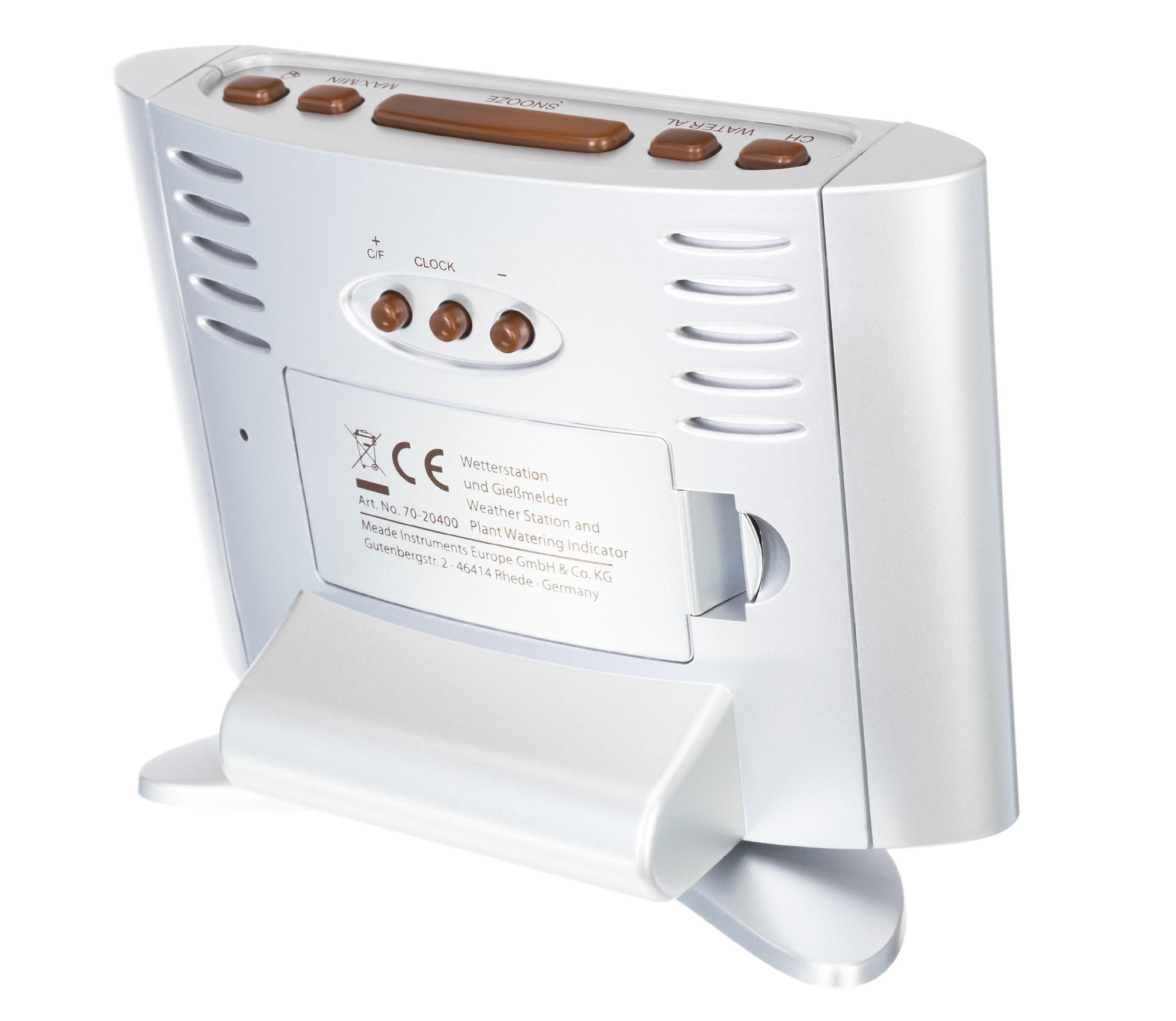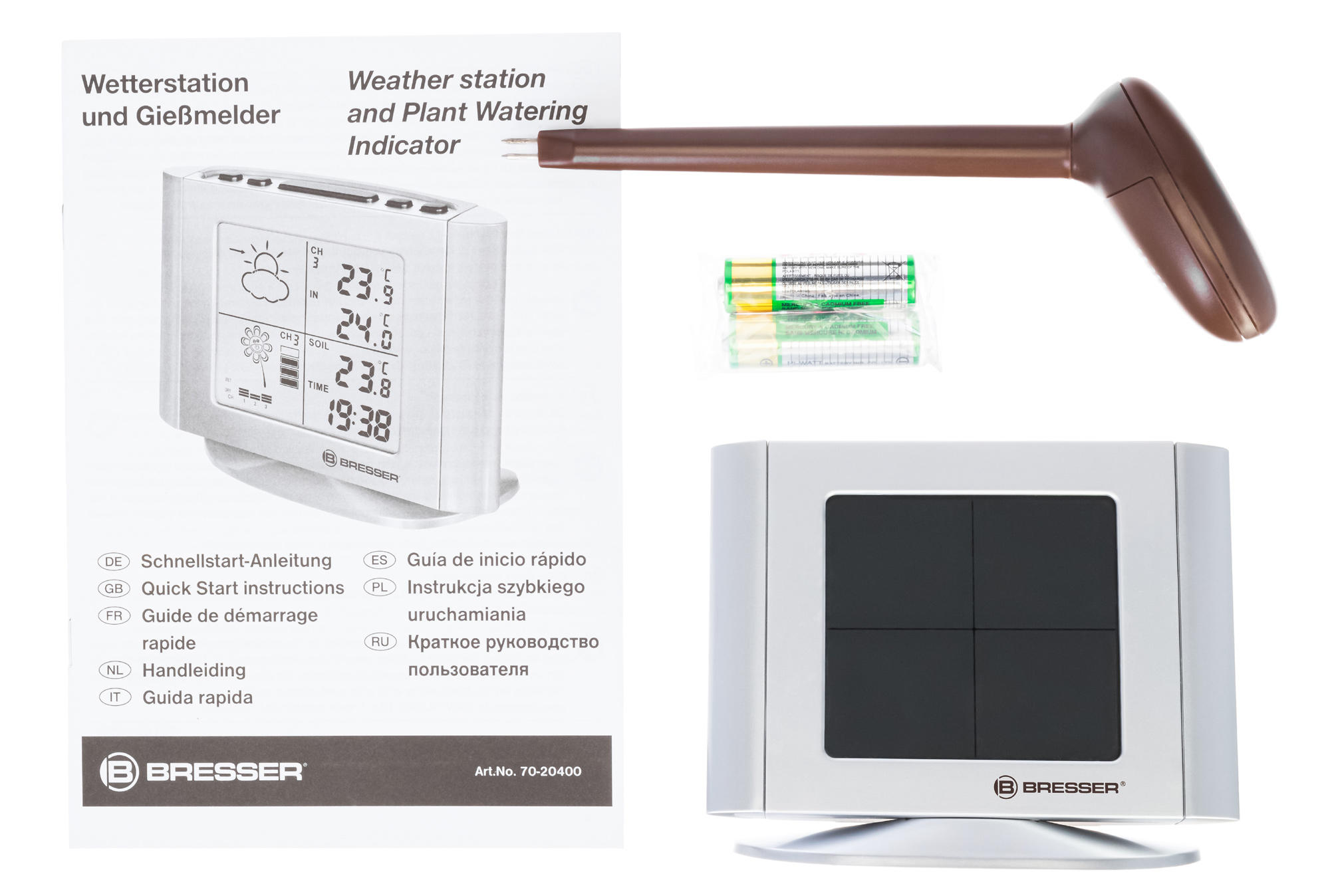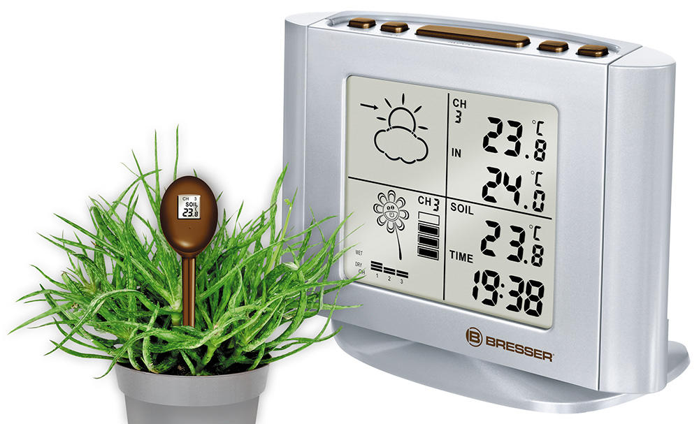 Метеостанция Bresser с индикатором полива растений пригодится тому, кто заботится о комнатных растениях и хочет быть уверенным в том, что они растут в идеальных условиях. Включенный в комплектацию беспроводной датчик устанавливается в почву, в которой произрастает горшочное растение, и в режиме реального времени следит за изменениями температуры воздуха, а также температуры и влажности почвы. О любых негативных изменениях датчик уведомляет незамедлительно. Всего к метеостанции можно подключить до пяти таких датчиков.