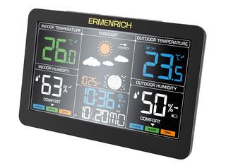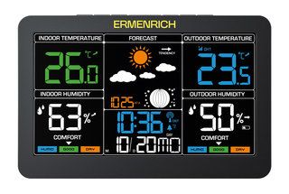 Метеостанция Ermenrich Report WR60 – это компактный гаджет, которому найдется место в любом современном жилище или офисе. Прибор может похвастаться широкой функциональностью, позволяющей измерять атмосферные показатели как на улице, так и внутри помещения. Он также помогает своевременно узнавать другую полезную информацию об окружающем мире, например текущую фазу Луны или прогноз погоды на ближайшее время. Для измерений под открытым небом прибор использует беспроводной наружный датчик с радиусом улавливания радиосигнала до 80 метров – он уже включен в комплект.