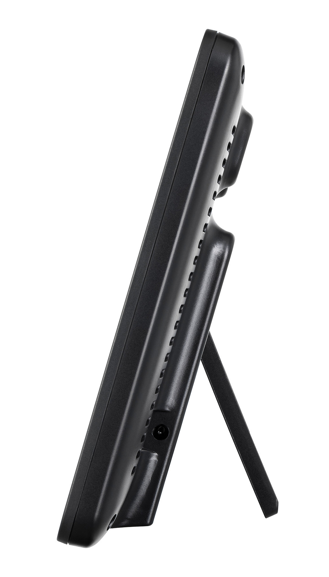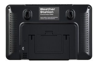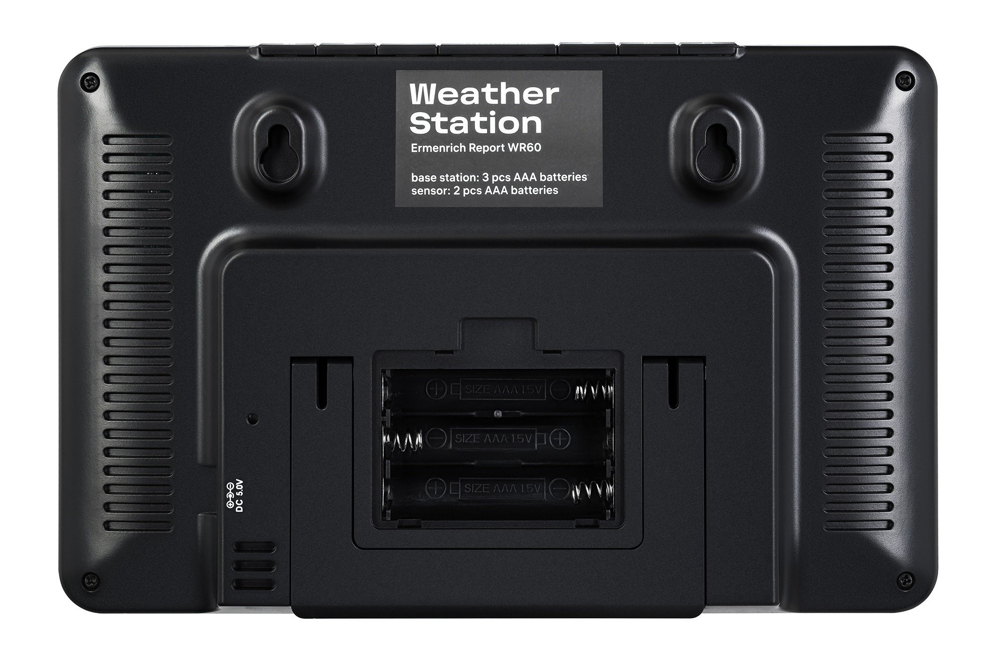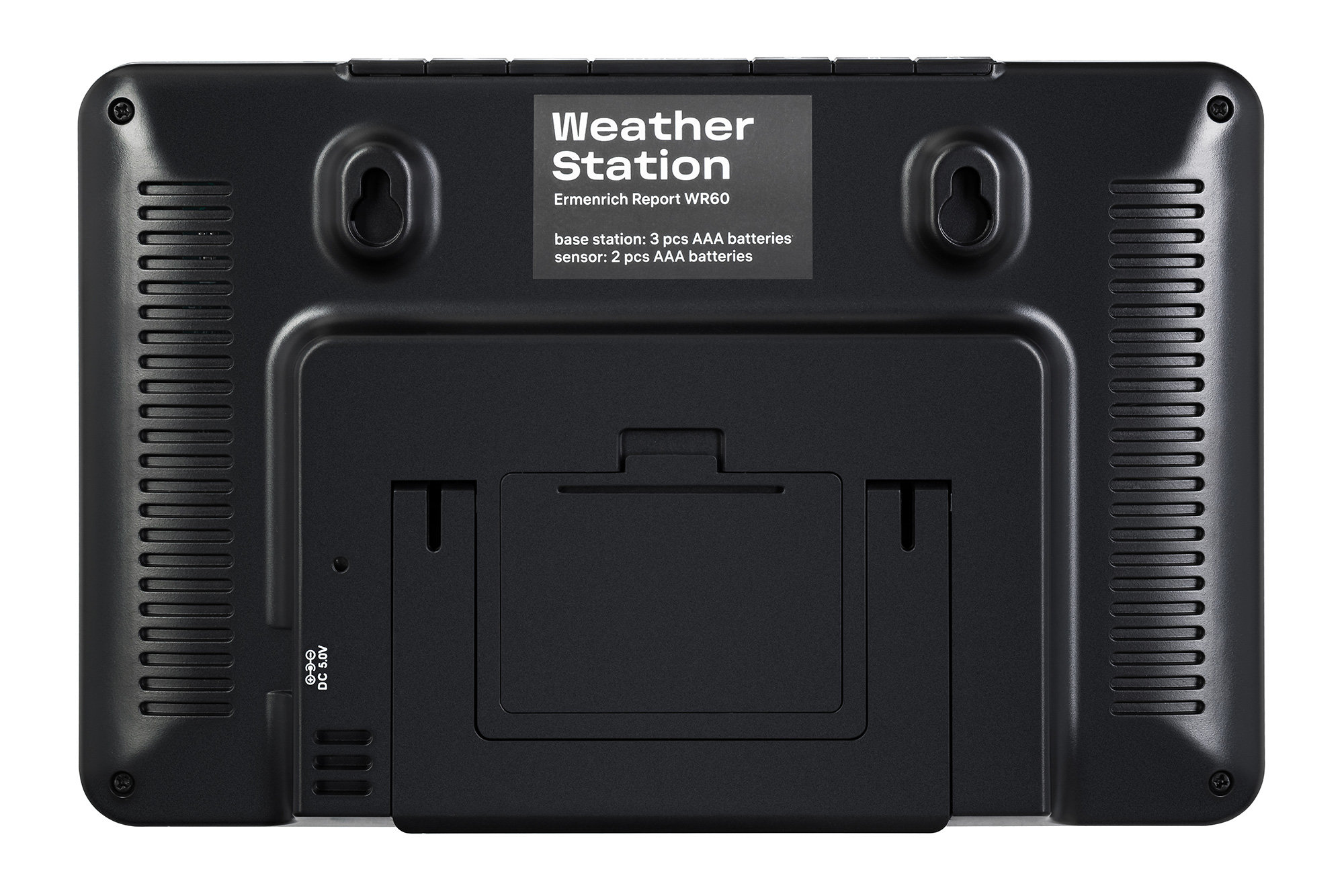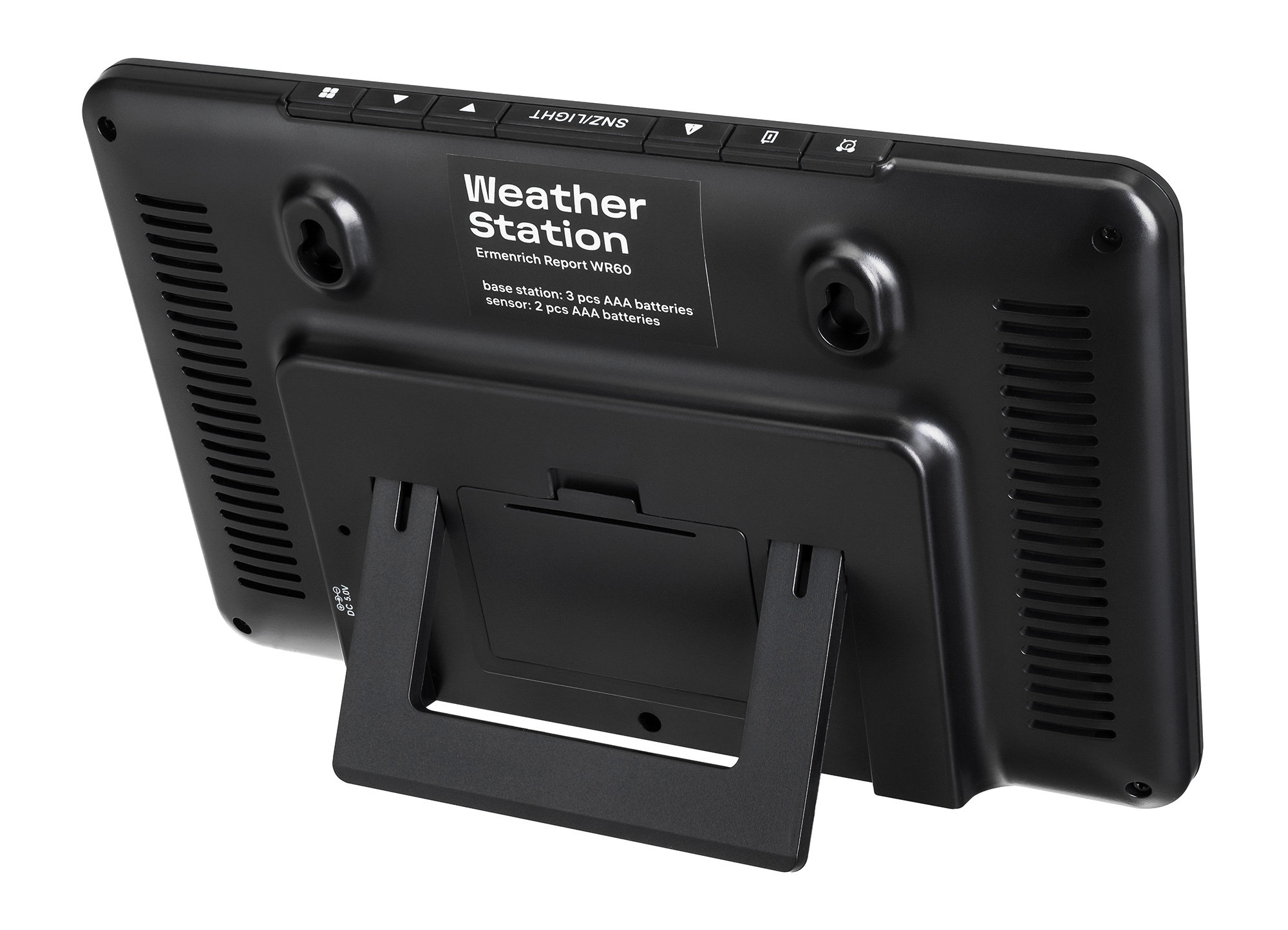 Ermenrich Report WR60 выгодно выделяется среди аналогичных моделей своим дизайном: тонкий пластиковый корпус черного цвета с экраном в удобной горизонтальной ориентации можно поставить на стол или повесить на стену, не переживая, что он нарушит внешний вид помещения или помешает стилю интерьера. Для удобства понимания дисплей разделен на 6 визуальных зон, в каждой из которых отображается разная информация об окружающей среде: температура и влажность воздуха дома и на улице, уровень комфорта, прогноз погоды и атмосферное давление, текущее время, статус активации будильника и календарь (месяц, число, день недели). Справа на экране также можно увидеть индикатор заряда батареи – его появление вовремя сообщит пользователю о необходимости замены элементов питания. Основной блок Ermenrich Report WR60 питается от 3 батареек типа ААА или от сети. Наружный беспроводной датчик работает от 2 батареек типа ААА (рекомендуется использовать щелочные).