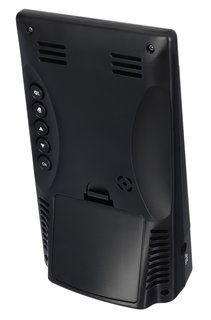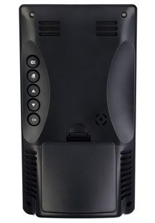 Большая часть управления вынесена на заднюю крышку основного модуля, на передней части размещена только одна кнопка двойного назначения: она отвечает за подсветку и функцию повтора сигнала будильника. Для работы термогигрометра необходимы стандартные батарейки, также его можно запитать от сети переменного тока через комплектный USB-кабель. Источник питания датчика – батарейки.