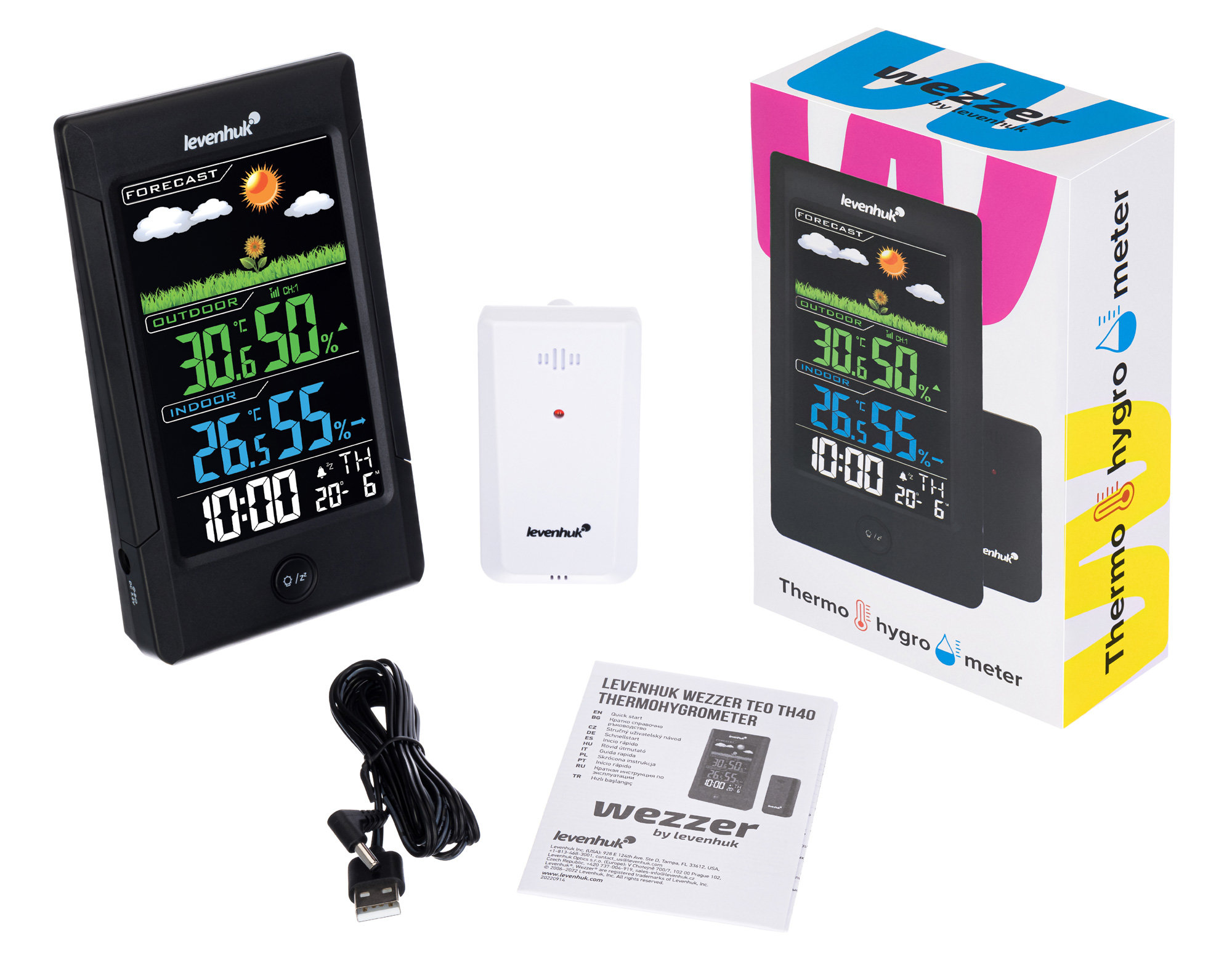 Levenhuk Wezzer Teo TH40 – термогигрометр в стильном и лаконичном исполнении. Он отлично впишется в современный интерьер, будет уместно смотреться в кабинете, гостиной или офисе. Прибор комплектуется наружным датчиком, работающим по радиоканалу, поэтому может проводить измерения в двух местах одновременно. Расстояние между основным модулем и датчиком не должно превышать 80 метров.