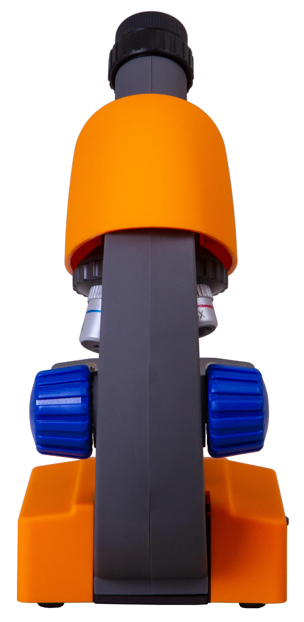 Для фиксирования микропрепаратов на предметном столике используются металлические зажимы. Источник освещения – светодиод, расположенный в нижней части микроскопа. Свет от него проходит через диск с диафрагмами, при помощи которого можно регулировать степень освещенности образца. Яркость подсветки тоже регулируется. Для работы подсветки используются батарейки (в комплекте).