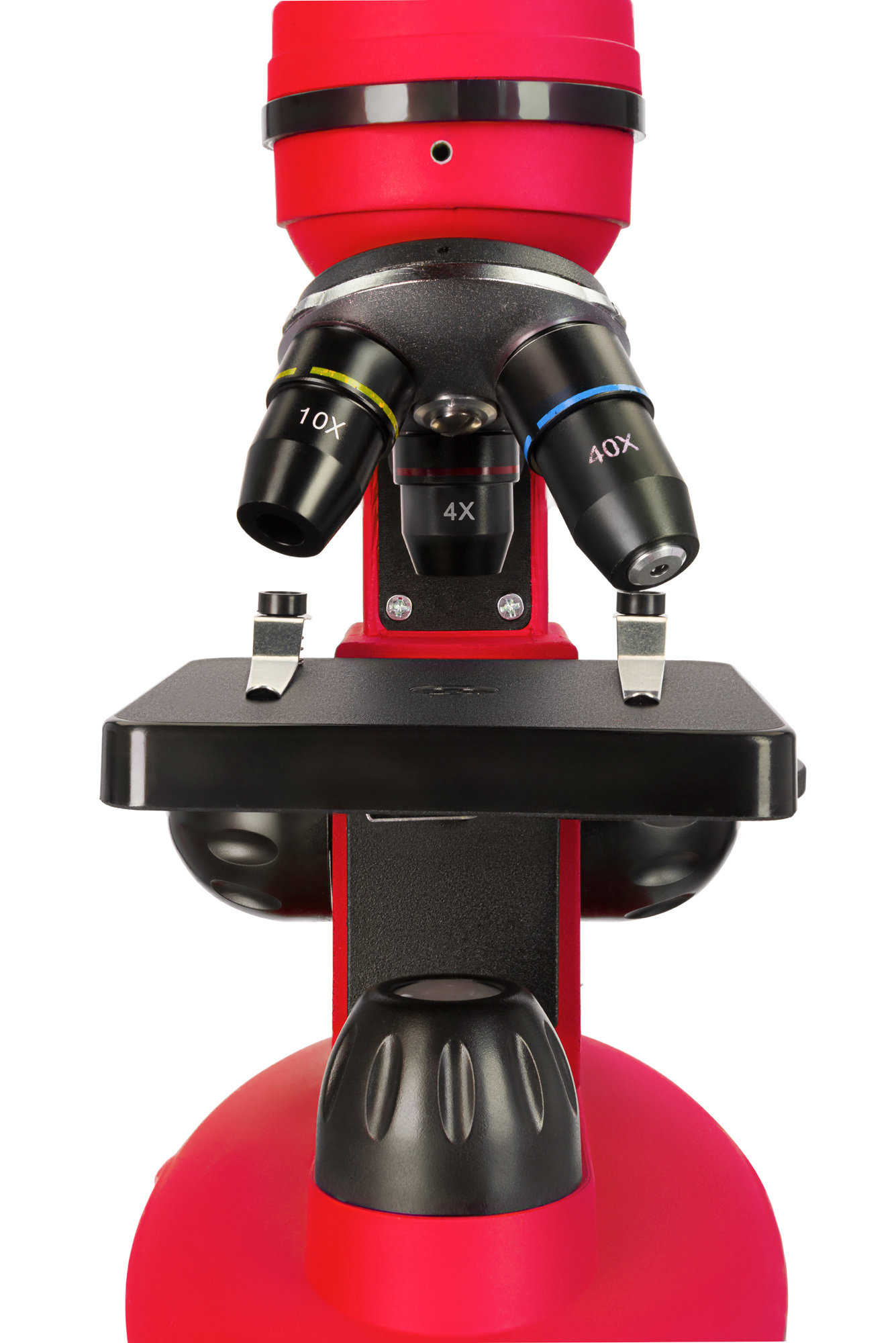 Микроскоп имеет монокулярную насадку, отклоненную на 30°, и револьверное устройство, вмещающее 3 объектива. В комплекте широкопольный окуляр с 10-кратным увеличением и ахроматические объективы с кратностью 4х, 10х и 40х. 40-кратный объектив имеет защиту передней линзы – пружинящую оправу. Общее увеличение микроскопа находится в диапазоне от 40 до 400 крат. Все элементы оптики сделаны из стекла, поэтому прибор передает контрастное и четкое изображение по всему полю зрения.
