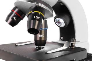 Микроскоп имеет монокулярную насадку, отклоненную на 30°, и револьверное устройство, вмещающее 3 объектива. В комплекте широкопольный окуляр с 10-кратным увеличением и ахроматические объективы с кратностью 4х, 10х и 40х. 40-кратный объектив имеет защиту передней линзы – пружинящую оправу. Общее увеличение микроскопа находится в диапазоне от 40 до 400 крат. Все элементы оптики сделаны из стекла, поэтому прибор передает контрастное и четкое изображение по всему полю зрения.