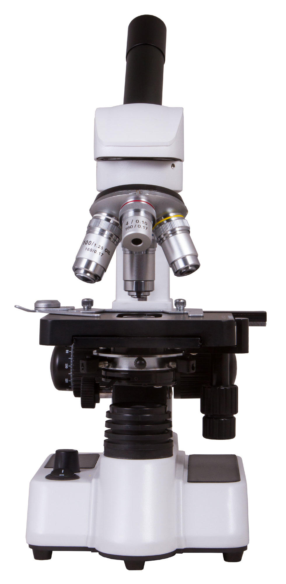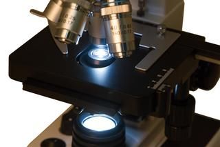 В микроскопе установлена ахроматическая оптика, которая создает четкую, детализированную и яркую картинку. На максимальном увеличении можно увидеть совсем маленькие детали структур. Для освещения образцов используется светодиодная подсветка, которая работает от сети переменного тока. Она расположена под предметным столиком, ее яркость можно менять. Регулируемый по высоте конденсор Аббе позволяет точно настраивать интенсивность светового потока. Для увеличения контрастности картинки можно использовать комплектный синий светофильтр.