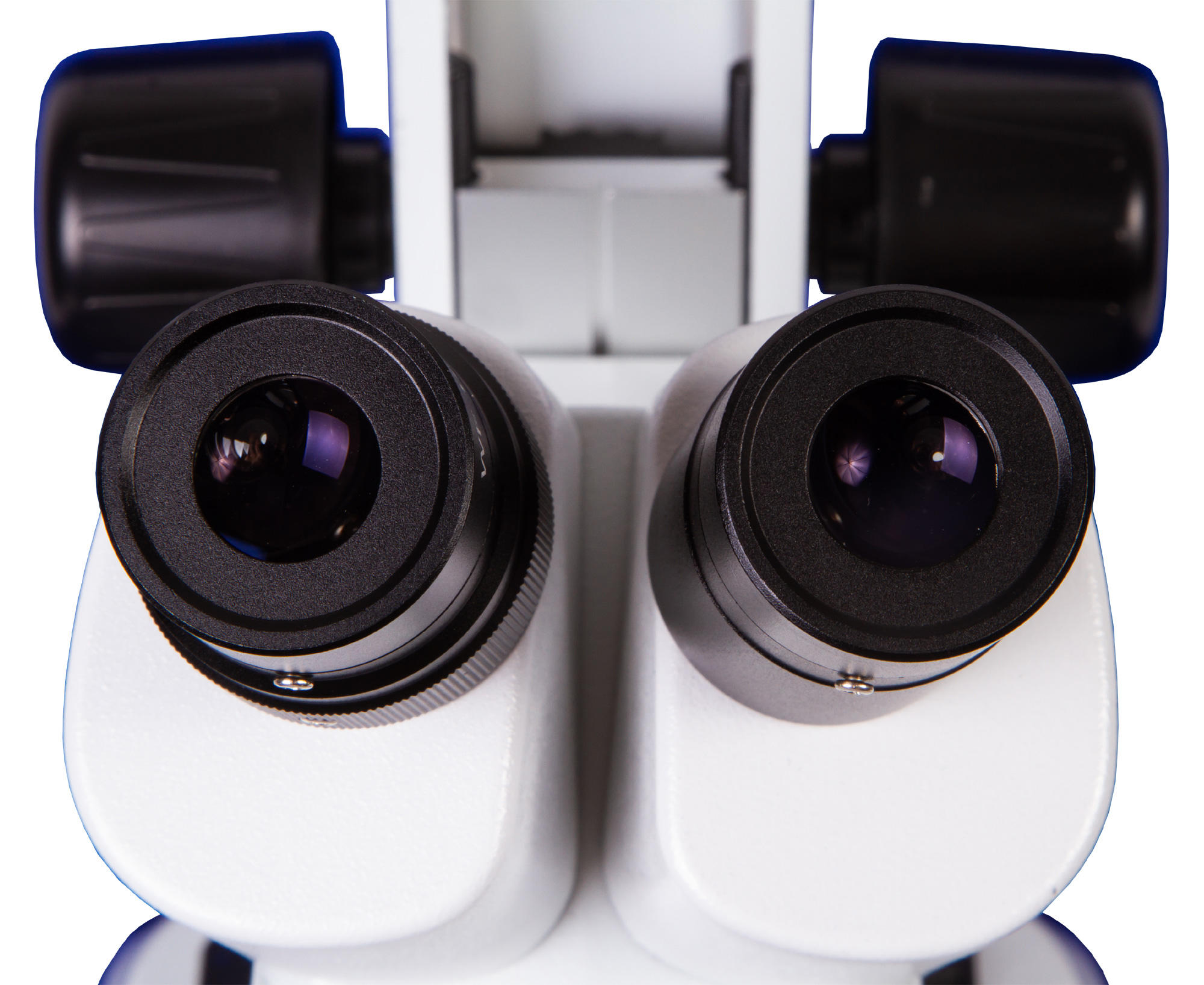 Оптическая схема микроскопа включает бинокулярную насадку с широкоугольными окулярами и поворотный объектив с изменяемым увеличением. Окуляры дают 10-кратное увеличение и снабжены резиновыми наглазниками. Объектив можно поворачивать, тем самым меняя его кратность, прямо по время исследований.