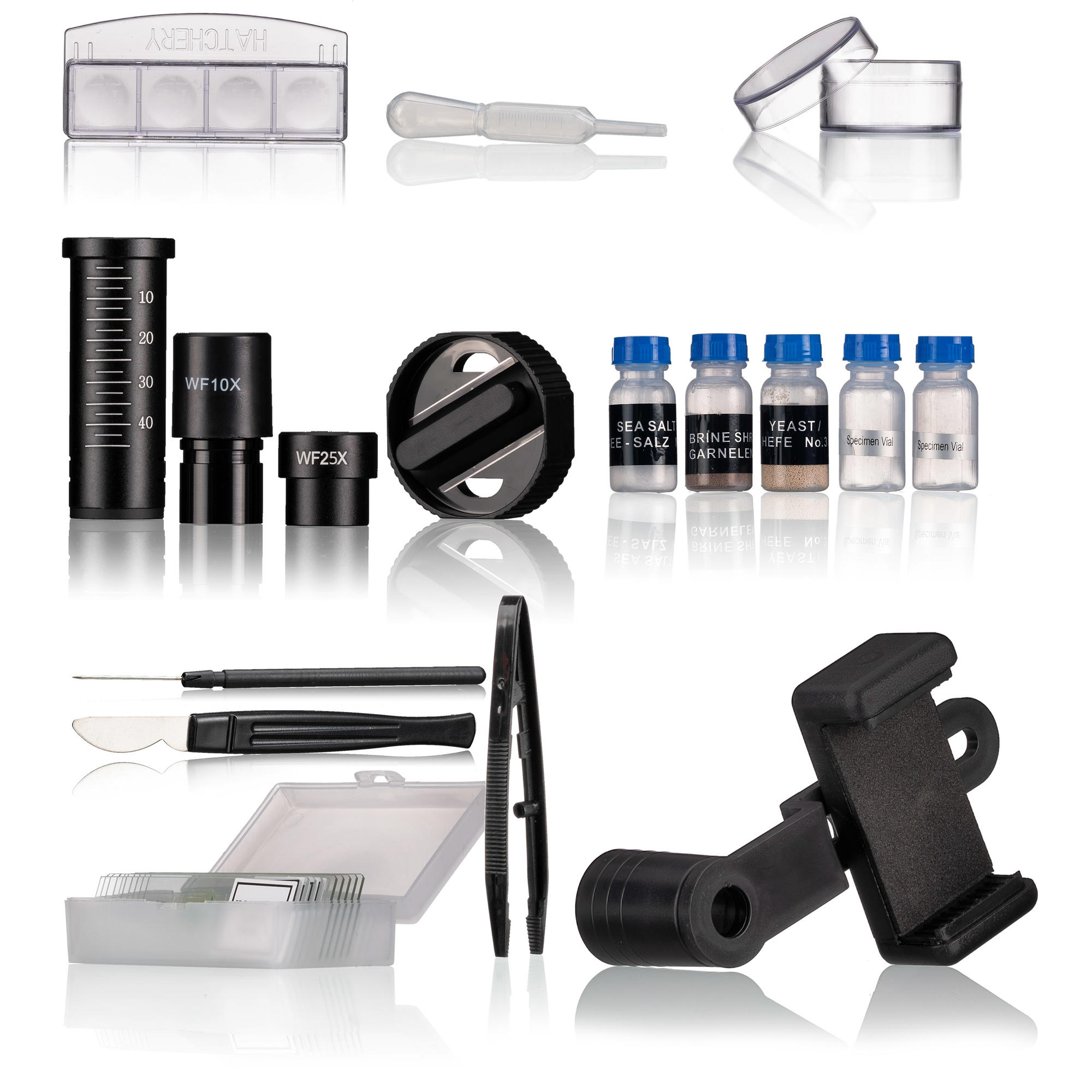 В микроскопе используются монокулярная насадка и револьверное устройство на три объектива. В комплектацию включены сразу пара окуляров с разным увеличением, а также двукратная линз Барлоу, поэтому приобретать дополнительные оптические аксессуары не понадобится. Еще один интересный аксессуар – держатель для смартфона. С его помощью на микроскопе можно закрепить мобильный телефон, чтобы использовать его камеру для фотографирования образцов. Также отметим и наличие набора для проведения опытов, который включает микропрепараты, инструменты и посуду.