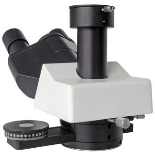 Тринокулярная насадка наклонена на 30 градусов и оборудована широкоугольными окулярами. Межзрачковое расстояние и диоптрии настраиваются под индивидуальные особенности каждого пользователя.