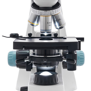 Образцы для исследований устанавливаются под объективом при помощи препаратоводителя. Резкость оптики настраивается ручками грубой и точной фокусировки. Система освещения расположена под предметным столиком и имеет регулировку яркости. Подсветка представляет собой светодиод с коллектором, а конденсор Аббе снабжен ирисовой диафрагмой и держателем фильтра.