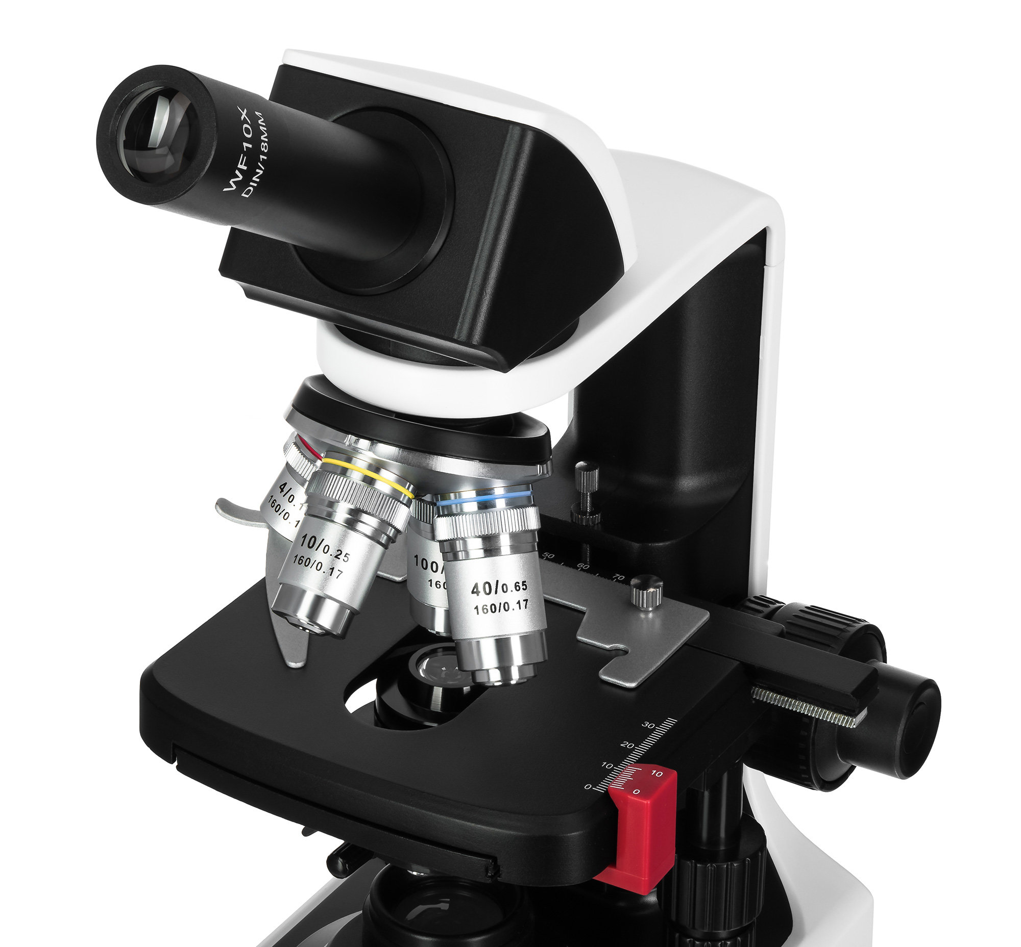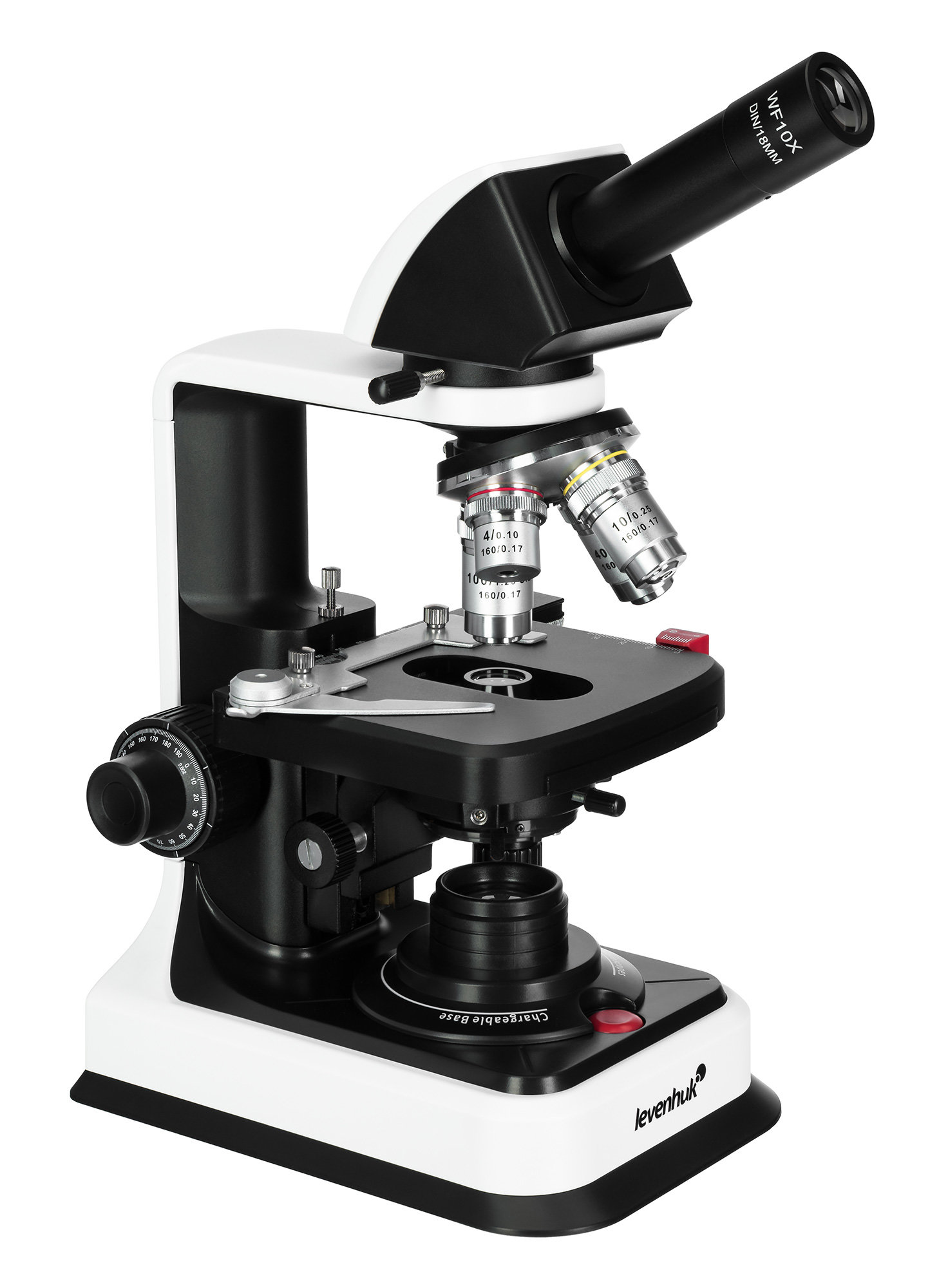 Микроскоп Levenhuk 450M имеет монокулярную насадку, установленную под углом 30° и вращающуюся на 360°. Это обеспечивает комфортный обзор образца и удобство работы как в индивидуальном, так и в групповом формате. Используемый в конструкции широкопольный окуляр имеет увеличение 10х и поле зрения 18 мм. В приборе предусмотрена функция диоптрийной коррекции в пределах ±5 D, благодаря чему им могут свободно пользоваться люди с особенностями зрения и носящие очки.