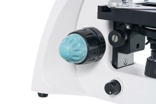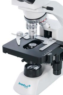 Микропрепараты размещаются на предметном столике при помощи препаратоводителя. Резкость оптики настраивается двумя ручками фокусировки – грубой и точной. Конденсор Аббе с ирисовой диафрагмой позволяет точно настроить освещение. Источник света – галогенная лампочка с коллектором, яркость которой можно регулировать. Блок подсветки расположен внизу, для питания используется сеть переменного тока.