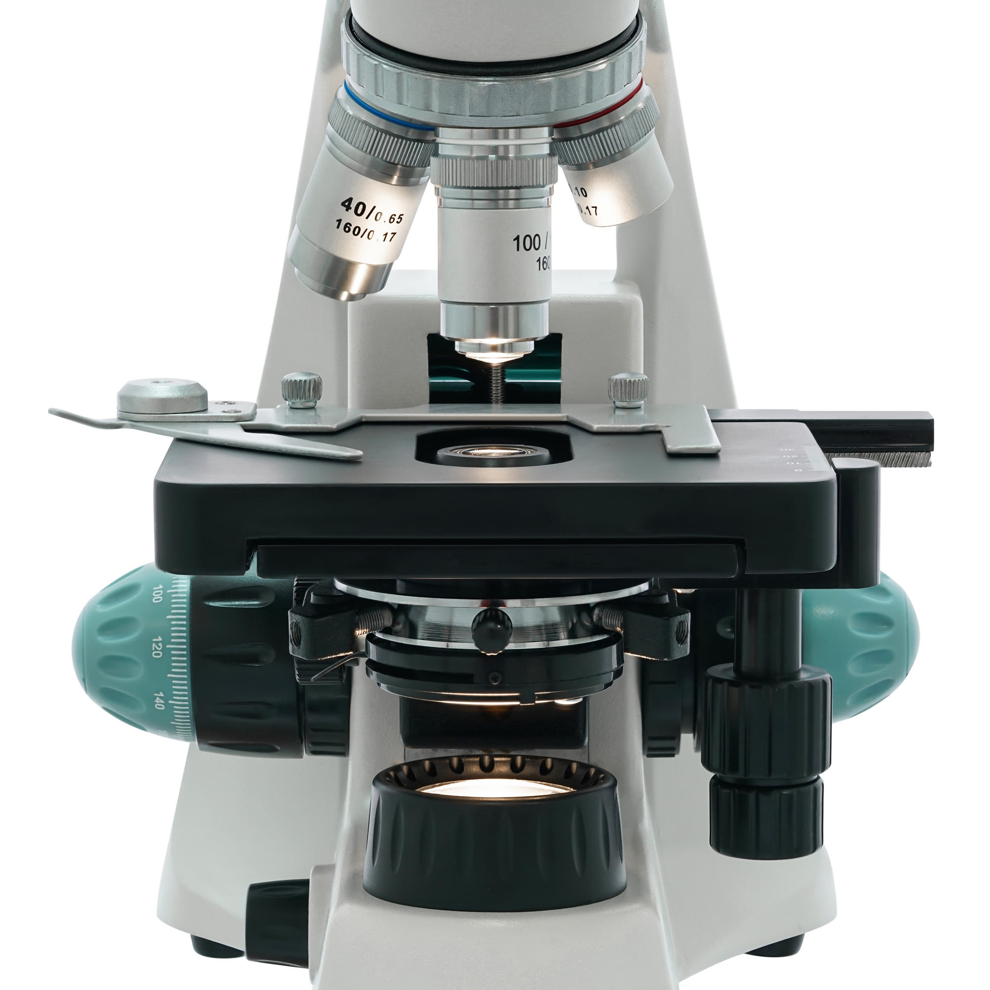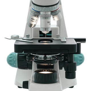Бинокулярная насадка имеет небольшой наклон, что делает длительную работу с микроскопом более удобной. При необходимости насадку можно разворачивать в любую сторону – доступны все 360°. Широкопольные окуляры дают хороший обзор и обеспечивают 10-кратное приближение. Четыре ахроматических объектива передают контрастное и «живое» изображение, позволяя рассматривать мелкие структуры. Общее увеличение микроскопа находится в диапазоне от 40 до 1000 крат. Объективы 40х и 100х снабжены пружинящими оправами передней линзы, 100-кратный объектив можно использовать для иммерсионных наблюдений.