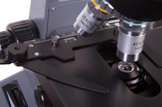 Револьверное устройство микроскопа рассчитано на 4 объектива. В комплекте вы найдете ахроматические объективы разной кратности и две пары окуляров. Комбинируя аксессуары, можно выбирать подходящее увеличение в диапазоне от 40х до 2000х. Иммерсионный объектив позволит на максимальной кратности лучше рассмотреть детали микропрепаратов, многократно усилив их яркость и глубину резкости. В комплекте идет флакон иммерсионного масла. Фокусировка на образце происходит с помощью ручки точной и грубой фокусировки. Такой способ настройки резкости используется исключительно в микроскопах высочайшего класса.