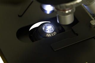 Освещение образцов происходит снизу. Источник освещения – яркий светодиод, яркость которого можно регулировать. Он направляет свет на образец и дает возможность выбрать интенсивность освещенности. Конденсор Аббе с ирисовой диафрагмой позволяет выбрать подходящую апертуру, чтобы точно направить световой пучок на область наблюдений.