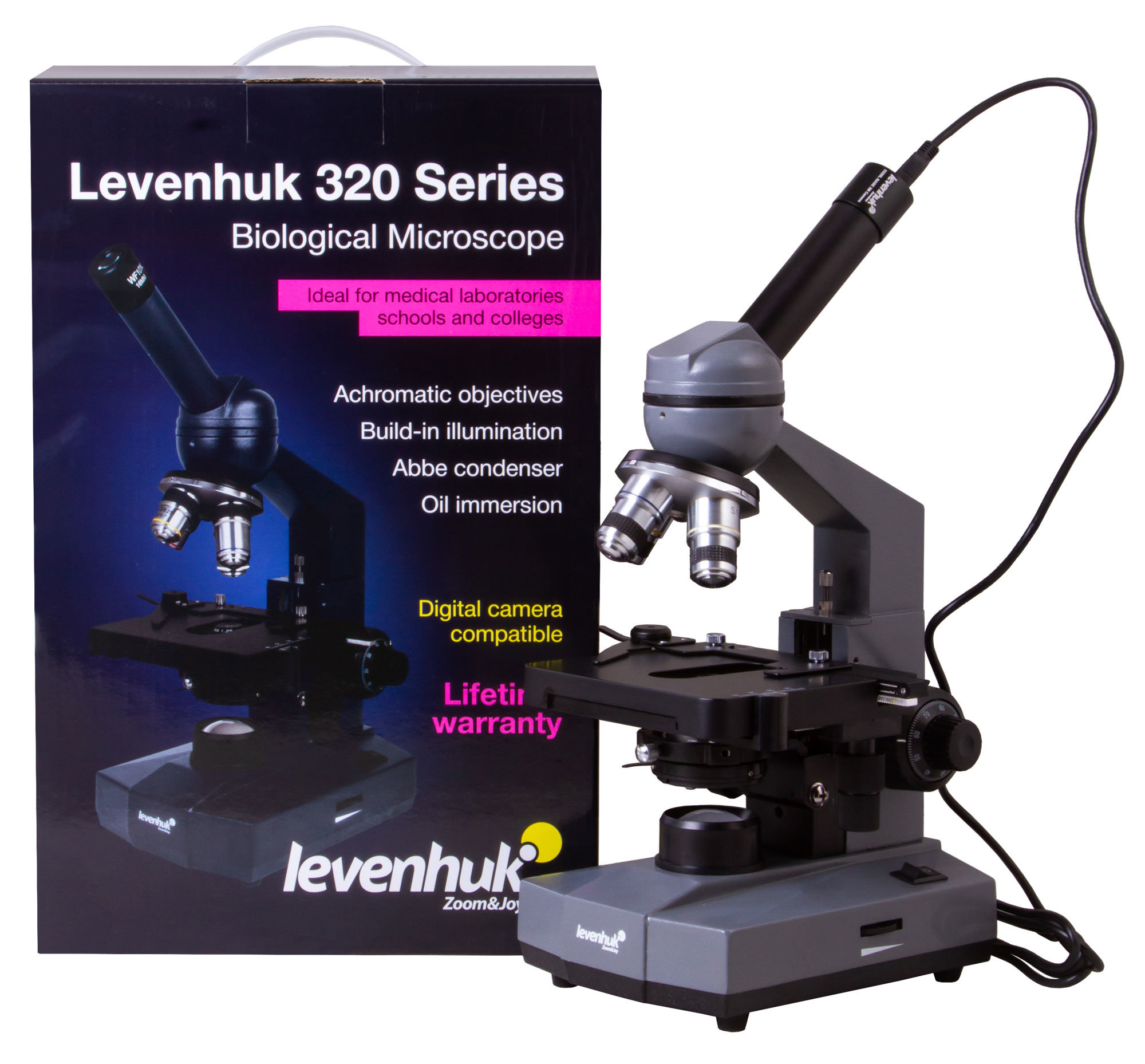 Но основная особенность микроскопа Levenhuk D320L BASE – 3-мегапиксельная цифровая камера. С ее помощью можно записывать свои наблюдения в фото- или видеоформате. Камера устанавливается прямо в окулярную трубку на место штатного окуляра, подключается к компьютеру при помощи комплектного USB-кабеля и передает картинку в режиме реального времени. Изображение с объектива отображается на подключенном мониторе в разрешении до 2048х1536 пикс. В комплект поставки включен диск со специальной программой, которая позволяет обрабатывать и редактировать отснятый материал.