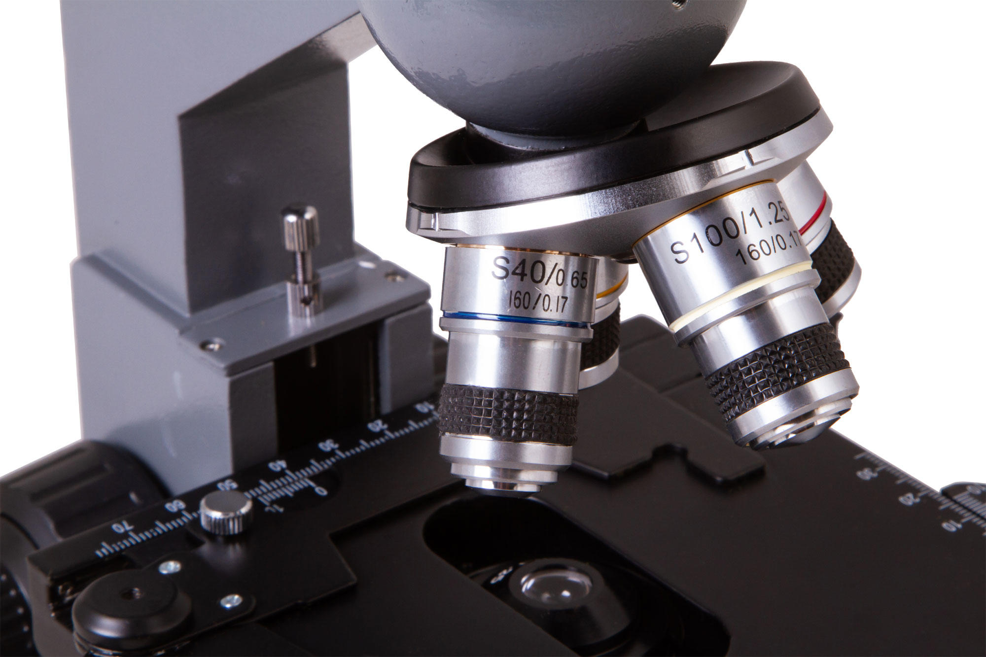 Предметный столик снабжен препаратоводителем, благодаря чему образцы можно быстро и точно размещать прямо под объективом. Ручки грубой и точной фокусировки помогают настроить резкость оптики наилучшим образом. Под предметным столиком находится конденсор Аббе с ирисовой диафрагмой. Под ним – светодиодная подсветка с регулировкой яркости. Подсветка может работать или от сети переменного тока, или от батареек.
