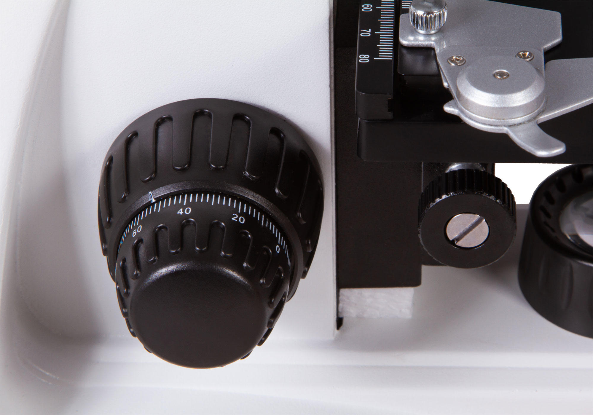 Двухкоординатный предметный столик снабжен препаратоводителем. Яркая светодиодная подсветка работает от сети переменного тока, есть регулировка яркости. Для более точной настройки освещения используется конденсор Аббе с ирисовой диафрагмой. В специальный держатель можно устанавливать светофильтры.