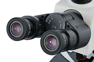 Тринокулярная насадка состоит из бинокулярной визуальной части и отдельной трубки для установки цифровой камеры. Насадка вращается на 360°, а визуальный блок отклонен на угол в 30°. Широкопольные окуляры с 10-кратным увеличением дают возможность работать с протяженными образцами. Диоптрийная коррекция помогает настроить их под особенности зрения наблюдателя.