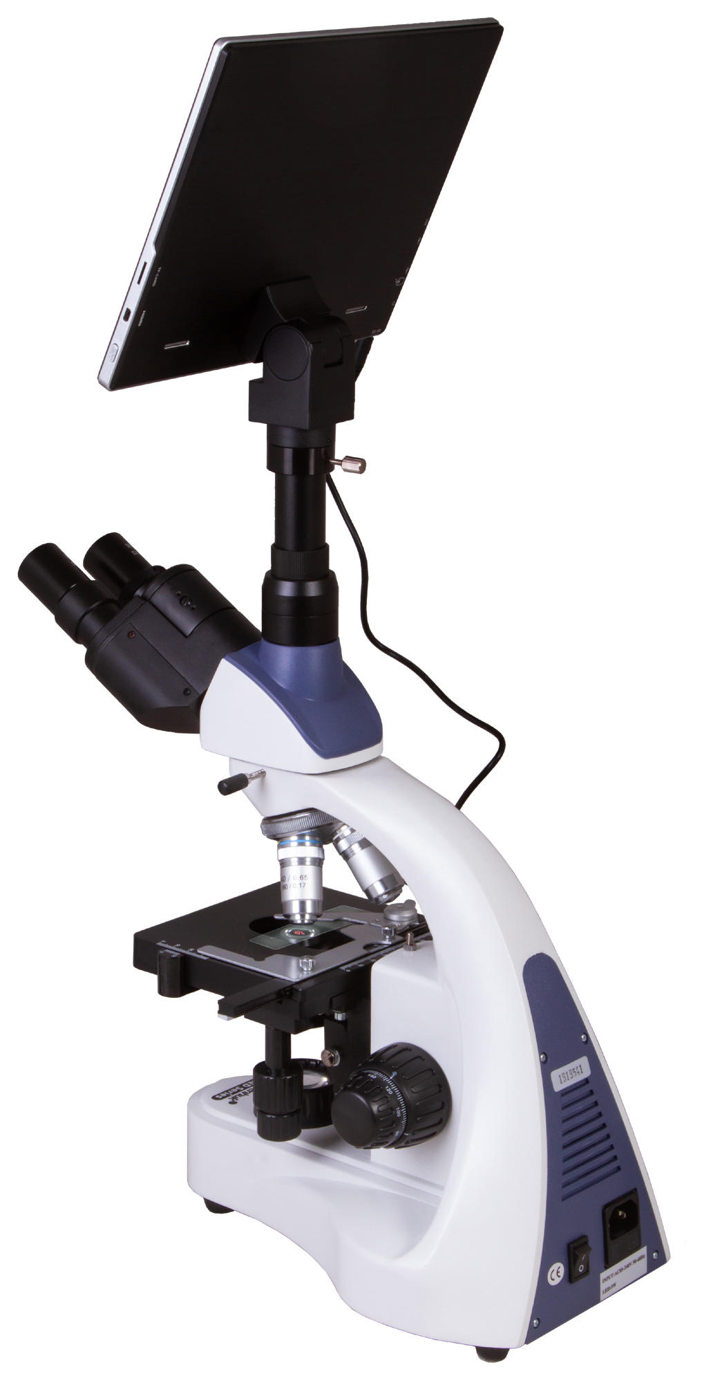 Тринокулярная насадка разделена на бинокулярную визуальную часть и отдельную вертикальную трубку, в которую устанавливается цифровая камера. Насадку можно вращать на 360°, а визуальный блок отклонен на 30-градусный угол. Для наблюдений используются широкопольные окуляры с диоптрийной коррекцией, которые дают 10-кратное увеличение. Револьверное устройство вмещает четыре ахроматических объектива, которые передают детализированную и контрастную картинку. Объективы 40х и 100х имеют пружинящие оправы, 100-кратный объектив используется для наблюдений иммерсионным методом. Оптические поверхности окуляров и объективов защищены антигрибковым покрытием.