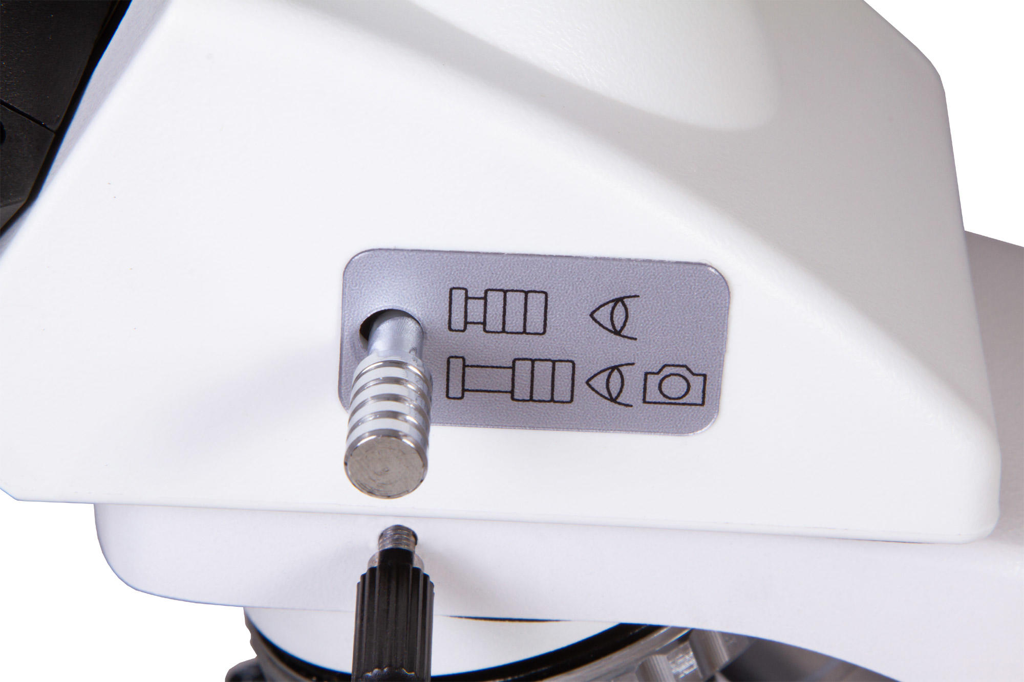 Тринокулярная насадка состоит из бинокулярного визуального блока и отдельной окулярной трубки для установки цифровой камеры. Вся насадка вращается на 360°, визуальная часть имеет небольшой наклон в 30°, а трубка для камеры расположена вертикально. Есть делитель светового потока. Цифровая камера идет в комплекте и позволяет записывать фото и видео в высоком качестве. Благодаря предустановленным программам и ЖК-экрану она самодостаточна – камеру не нужно подключать к компьютеру, чтобы использовать все ее возможности. Но при необходимости это можно делать, так как она совместима с разными внешними устройствами: мониторами, ноутбуками, картами памяти, даже наушниками и клавиатурой.