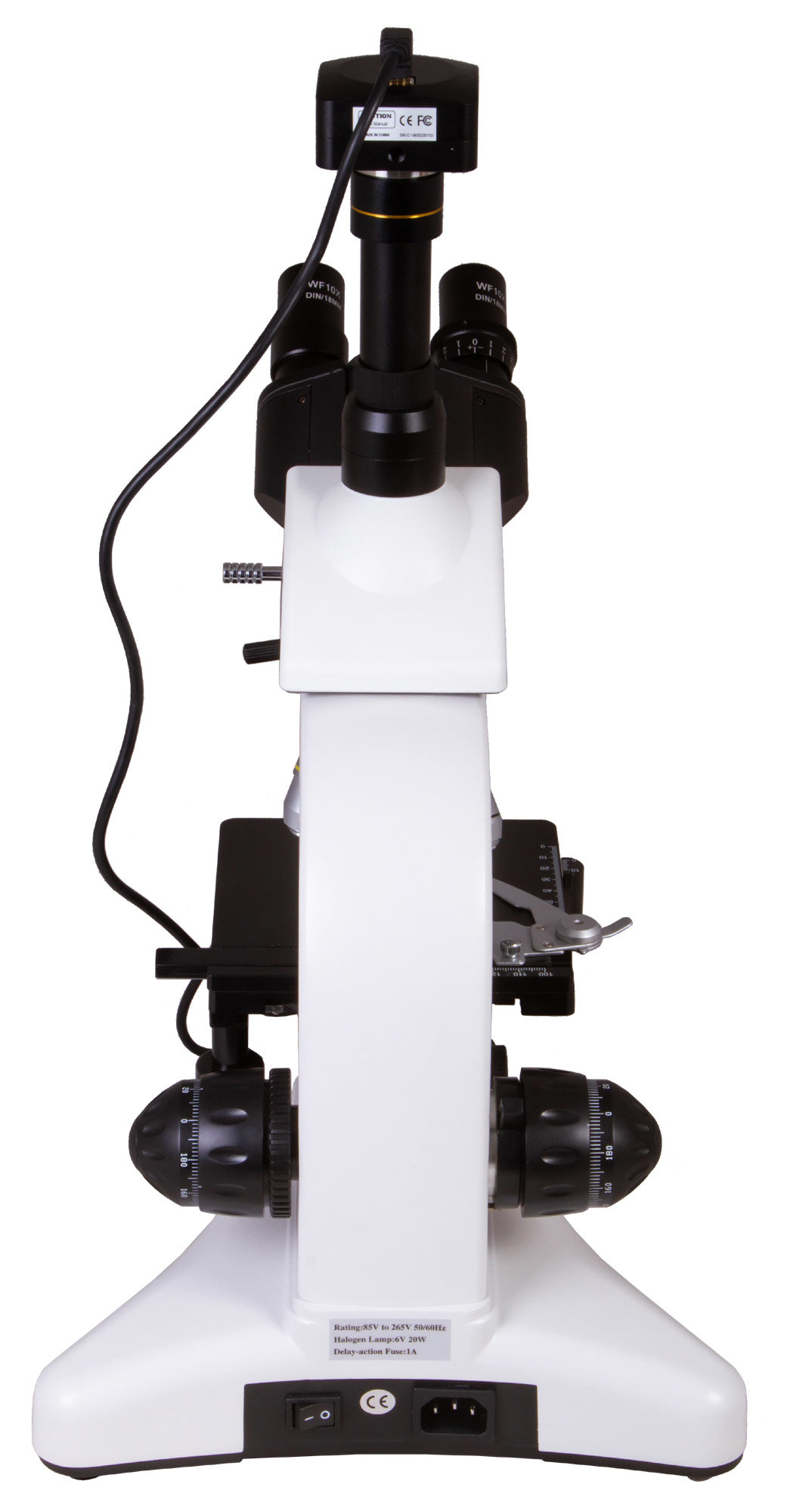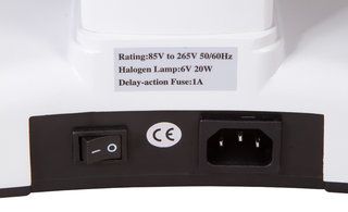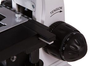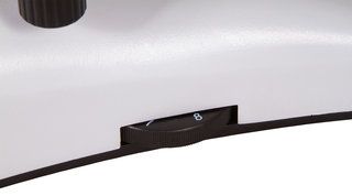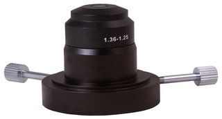 Предметный столик снабжен препаратоводителем. Под столиком находится конденсор Аббе с ирисовой диафрагмой и держателем фильтра. Вместо него можно установить темнопольный конденсор (масляный включен в комплект поставки). В нижней же части микроскопа расположена галогенная подсветка, яркость которой можно регулировать. Для работы подсветки требуется подключение к сети переменного тока.