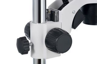 Бинокулярная насадка позволяет вести наблюдения сразу обоими глазами – это снижает нагрузку на зрение и делает длительную работу с образцами более удобной. Визуальная часть имеет наклон, всю насадку можно поворачивать на 360°. В комплектацию включены широкопольные окуляры с 10-кратным увеличением, которые обеспечивают хороший угол обзора. Объектив панкратический, а значит, кратность микроскопа можно изменять плавно, а не ступенчато. Общее увеличение оптики составляет от 7 до 45 крат. Есть грубая настройка резкости.