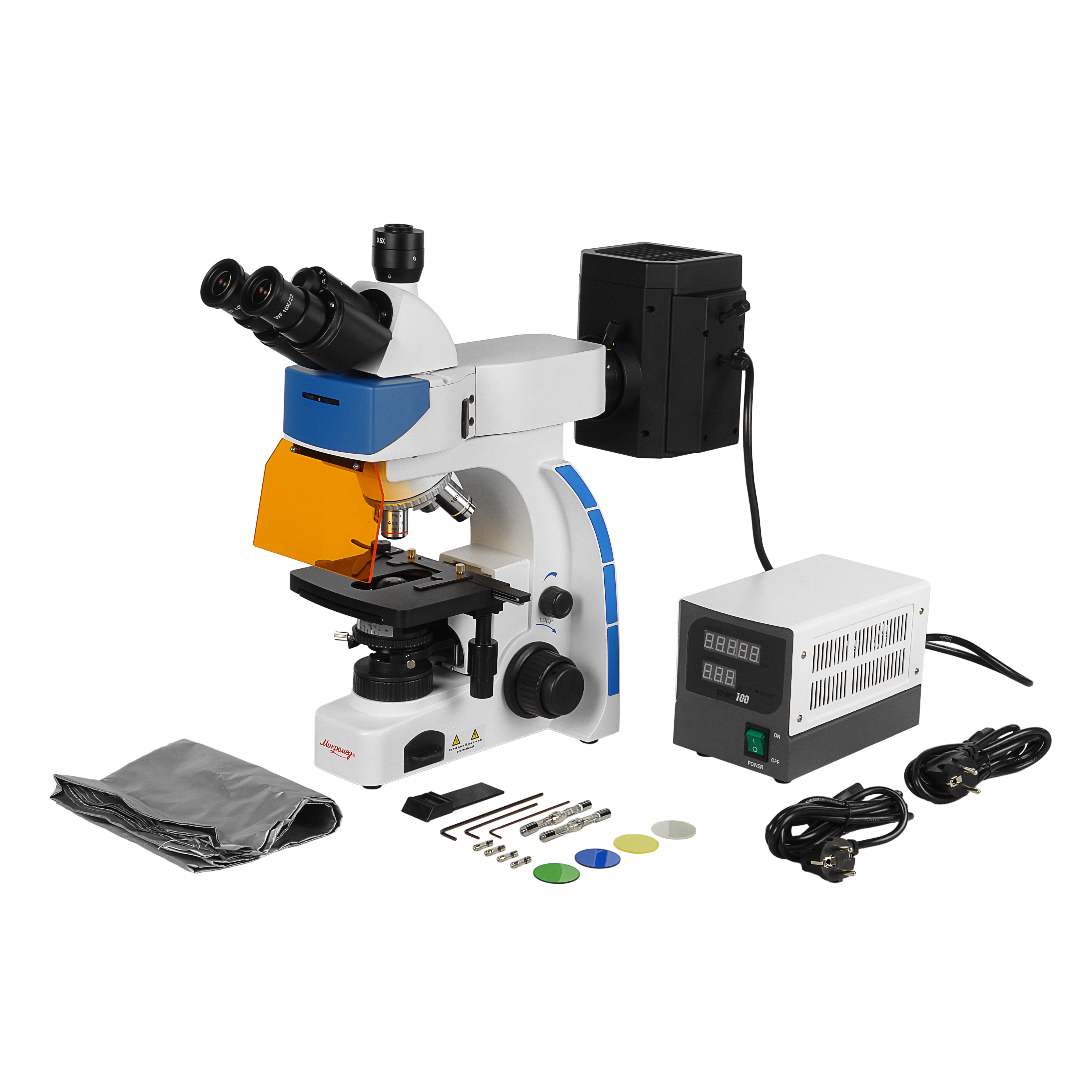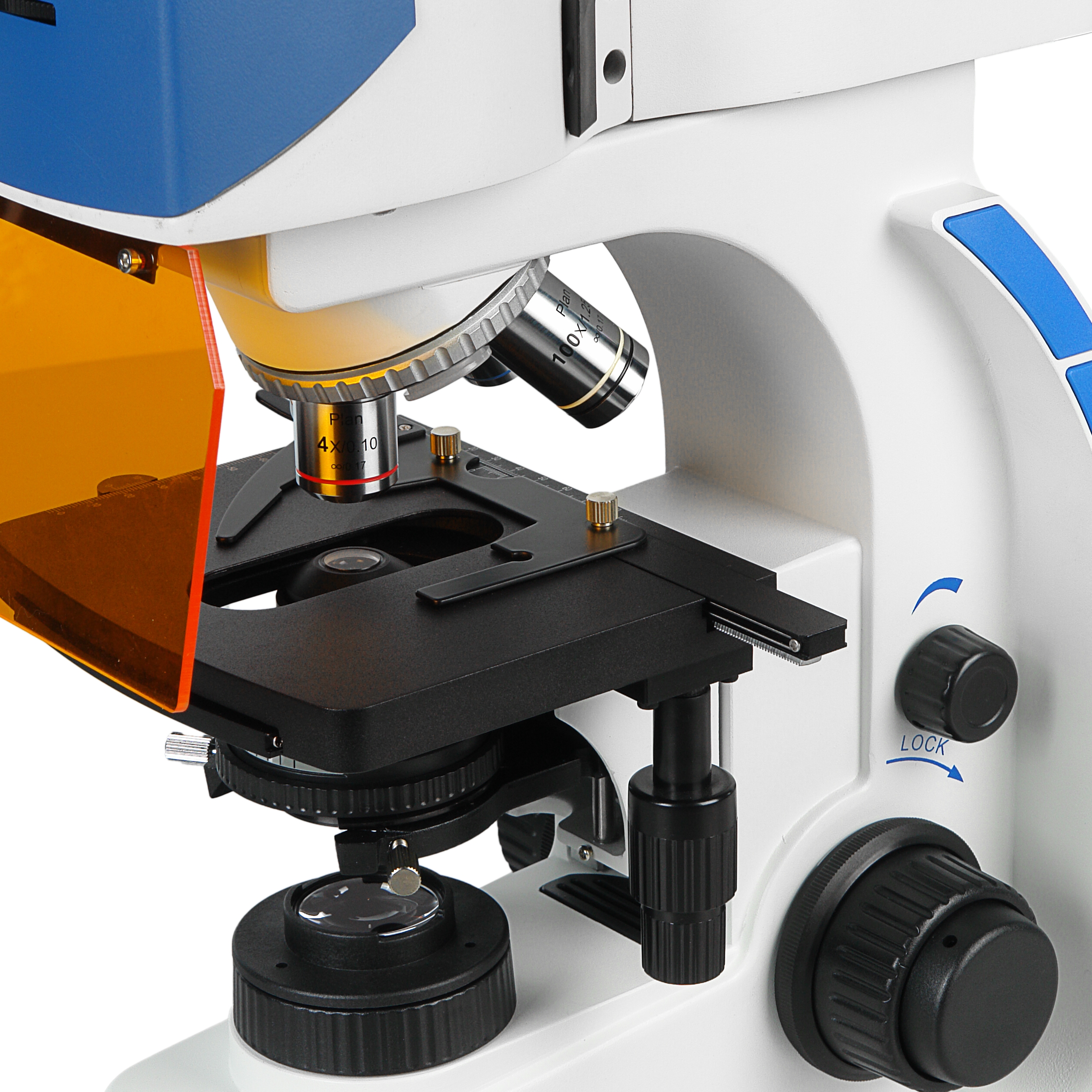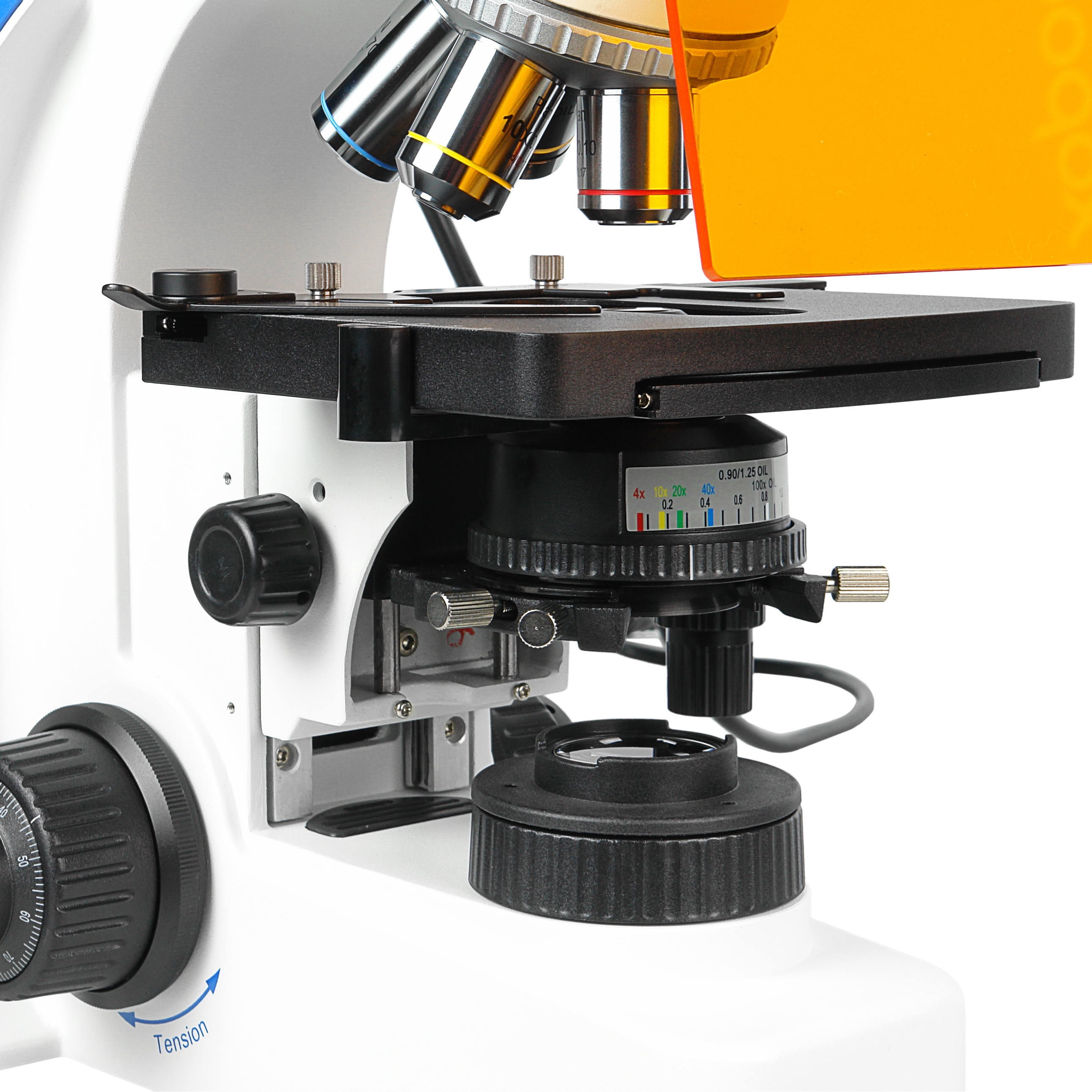 Микроскоп имеет два люминесцентных блока, каждый из которых состоит из дихроичного зеркала и светофильтров. Эти элементы с высокой точностью рассчитаны на определенный спектральный диапазон, что позволяет проводить исследования в необходимой области спектра.