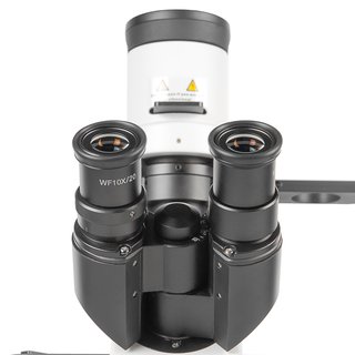 Конструкция микроскопа предусматривает использование камеры для просмотра изображений на внешнем мониторе и выводе данных на ПК. Для установки камеры в микроскоп встроен оптический канал визуализации. Камера устанавливается на оптический адаптер с резьбой стандарта C-mount. В комплект поставки микроскопа входит адаптер с увеличением 0.5х, позволяющий полноценно использовать большинство окулярных камер с сенсорами размерами от 1/3″ до 1/2.5″. Разделение светового потока между каналом визуализации и окулярами осуществляется оптическим переключателем. В выключенном положении 100% светового потока направляется на окуляры, во включенном положении переключателя свет разделяется между окулярами и каналом визуализации в соотношении 50:50.