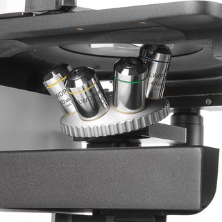 Все объективы скорректированы на бесконечность, имеют увеличенное рабочее расстояние и допускают исследования в лабораторной посуде с толщиной дна до 1,1 мм. На оптические детали нанесено многослойное антирефлексное и антигрибковое покрытие, позволяющее без ограничений использовать микроскоп в биологических лабораториях. Объективы микроскопа установлены на револьверном устройстве, рассчитанном на 5 объективов.